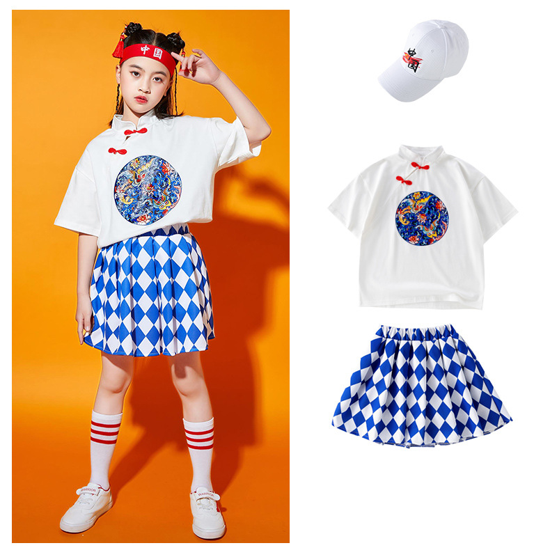 • 8901 여성용 흰색 반팔 + 8262 블루 체크 스커트 + 흰색 중국 야구 모자
