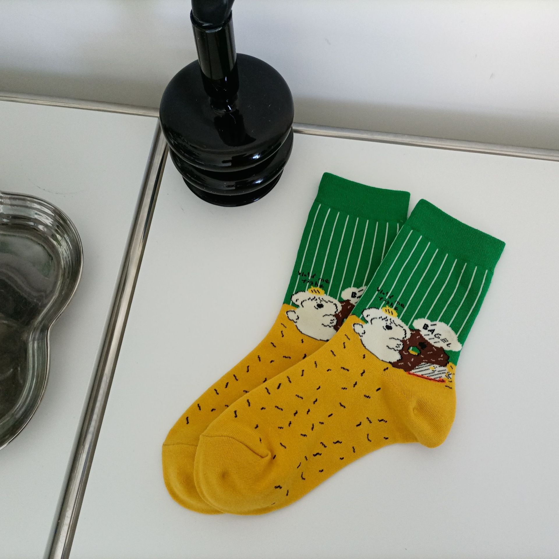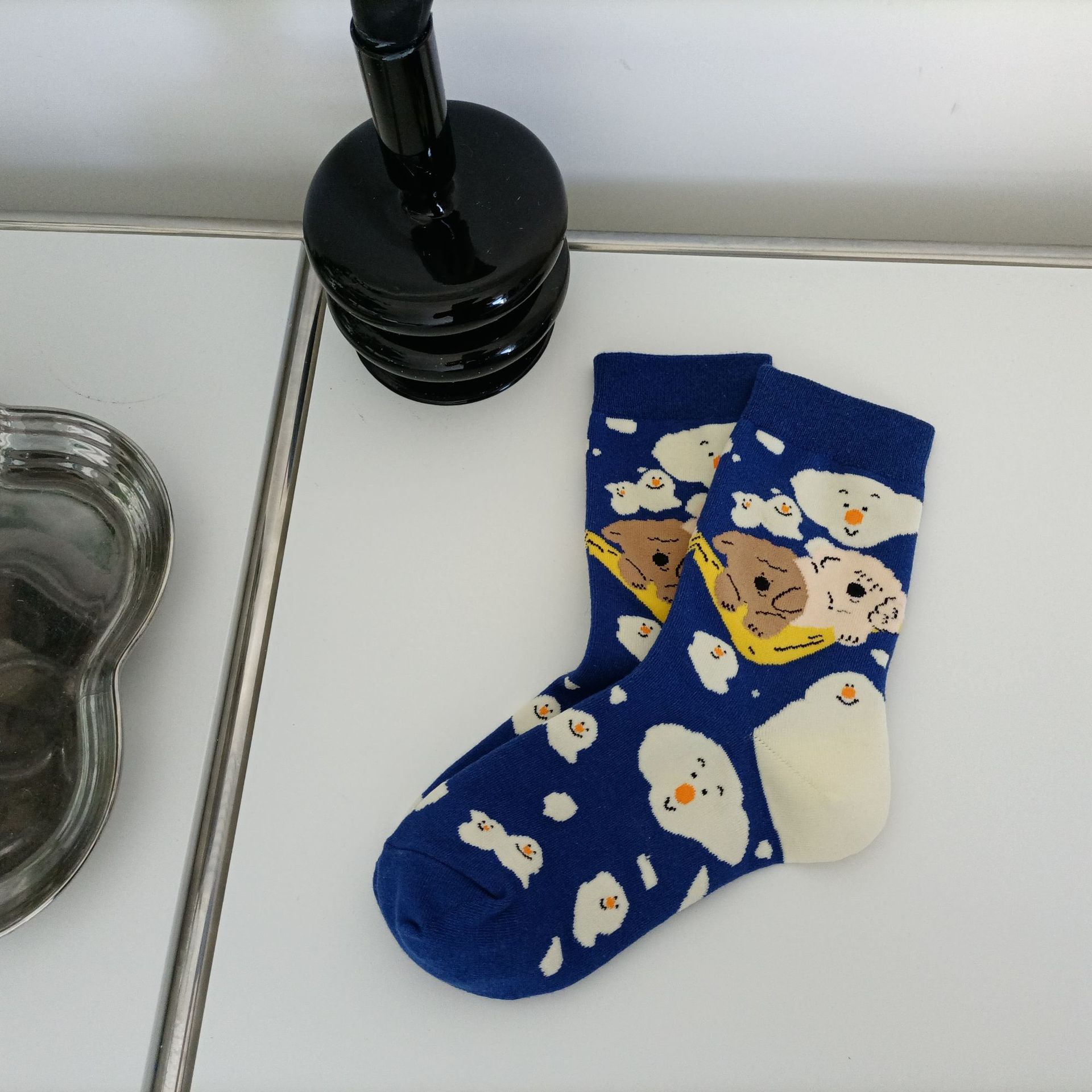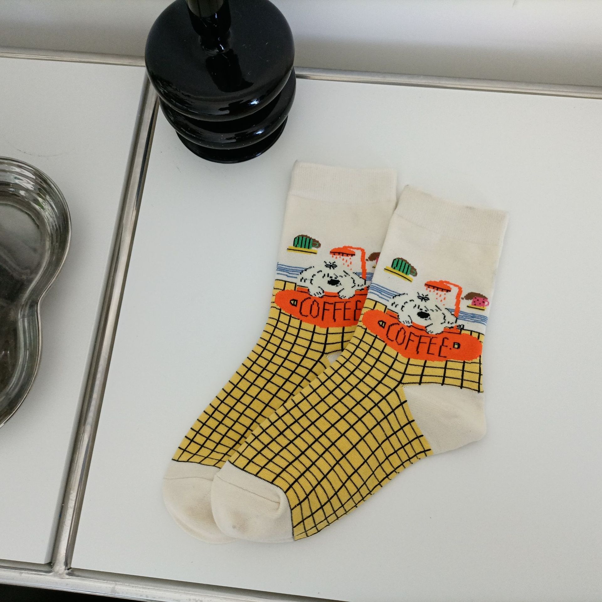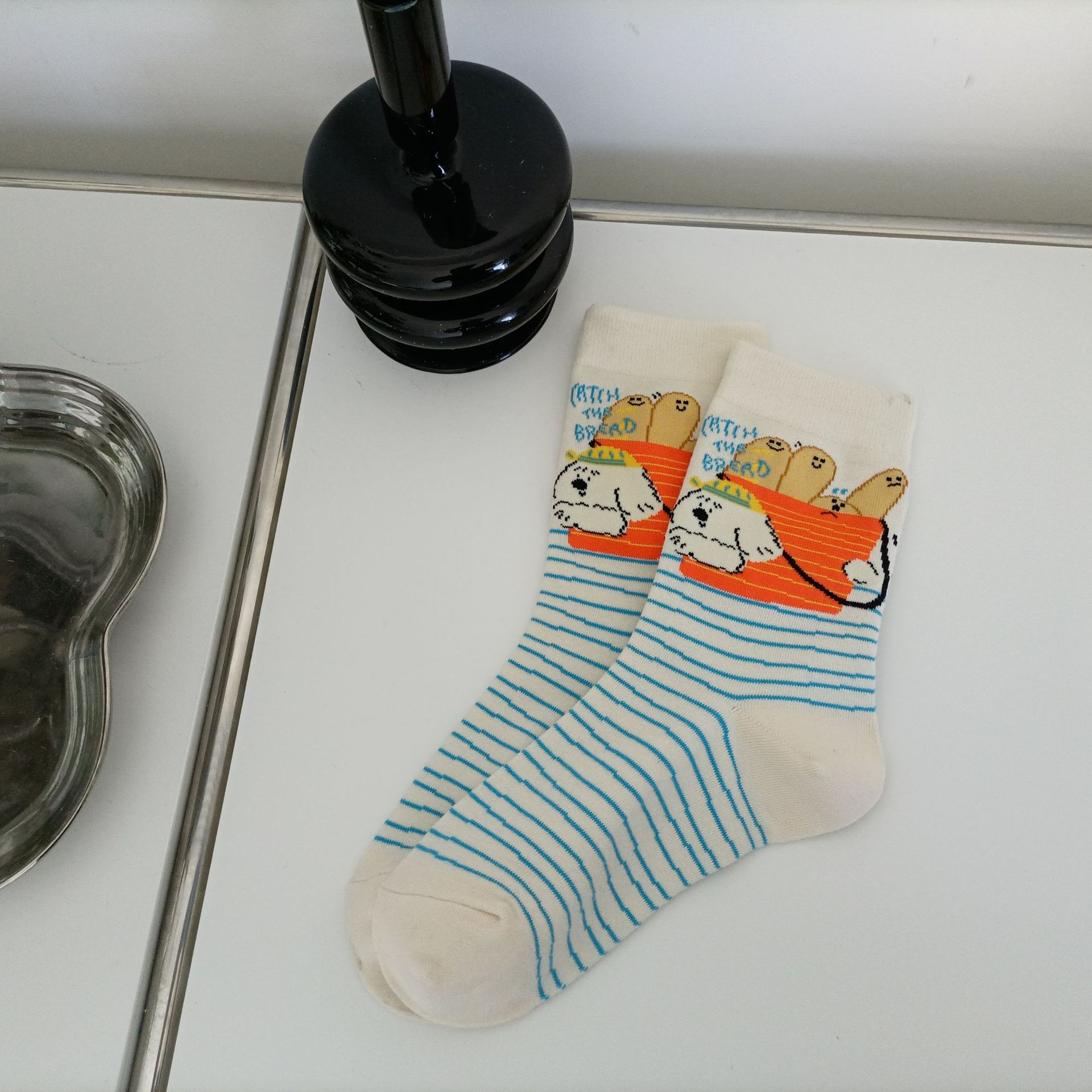 새로운 가을과 겨울 만화 크리 에이 티브 강아지 중간 길이 양말 귀여운 일본 격자 무늬 면 양말 여성용 한국 줄무늬 양말스토어 가기