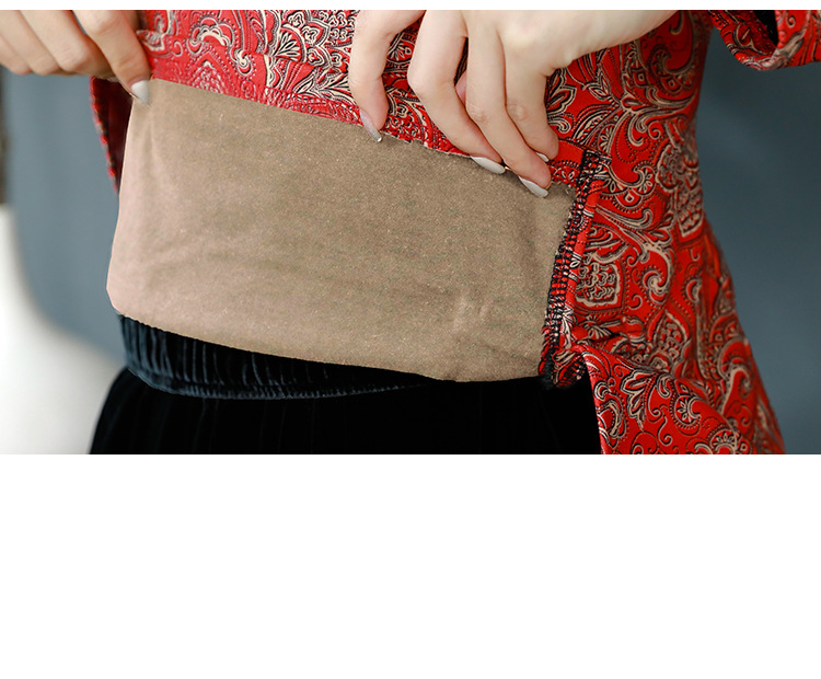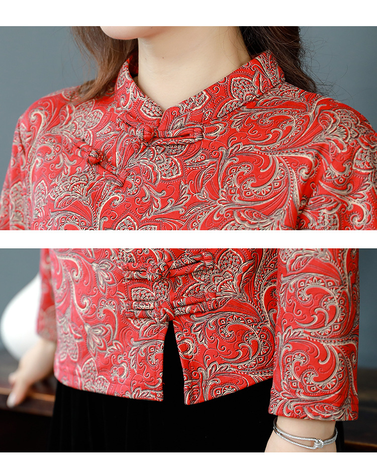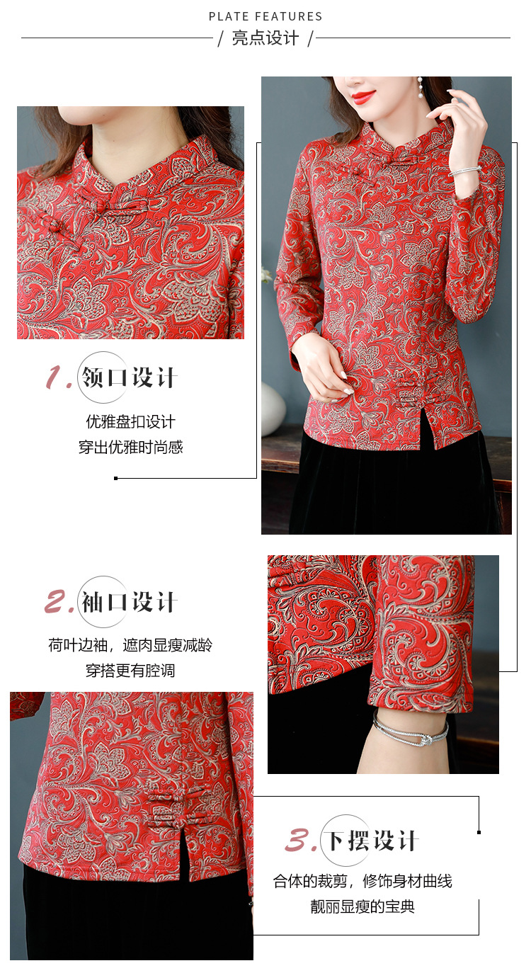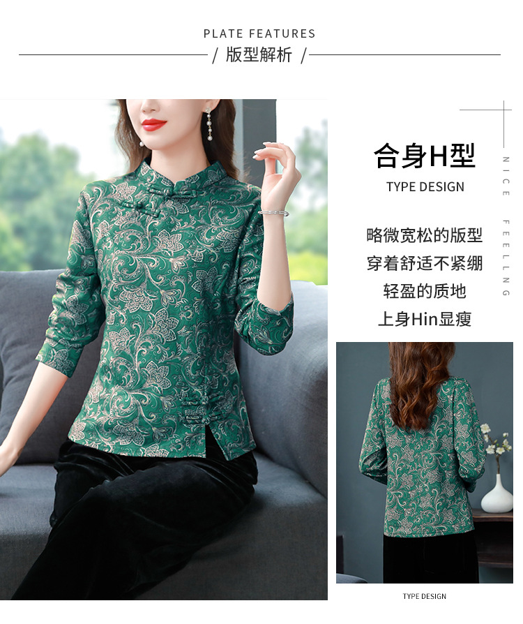 가을과 겨울 새로운 버클 긴 소매 레트로 블루와 화이트 도자기 드 벨벳 자카드 치파오 셔츠 티셔츠 어머니 플러스 사이즈 스트레치 탑스토어 가기