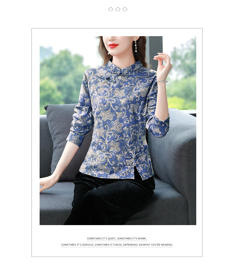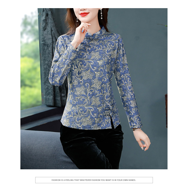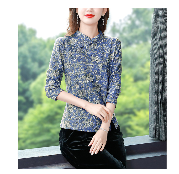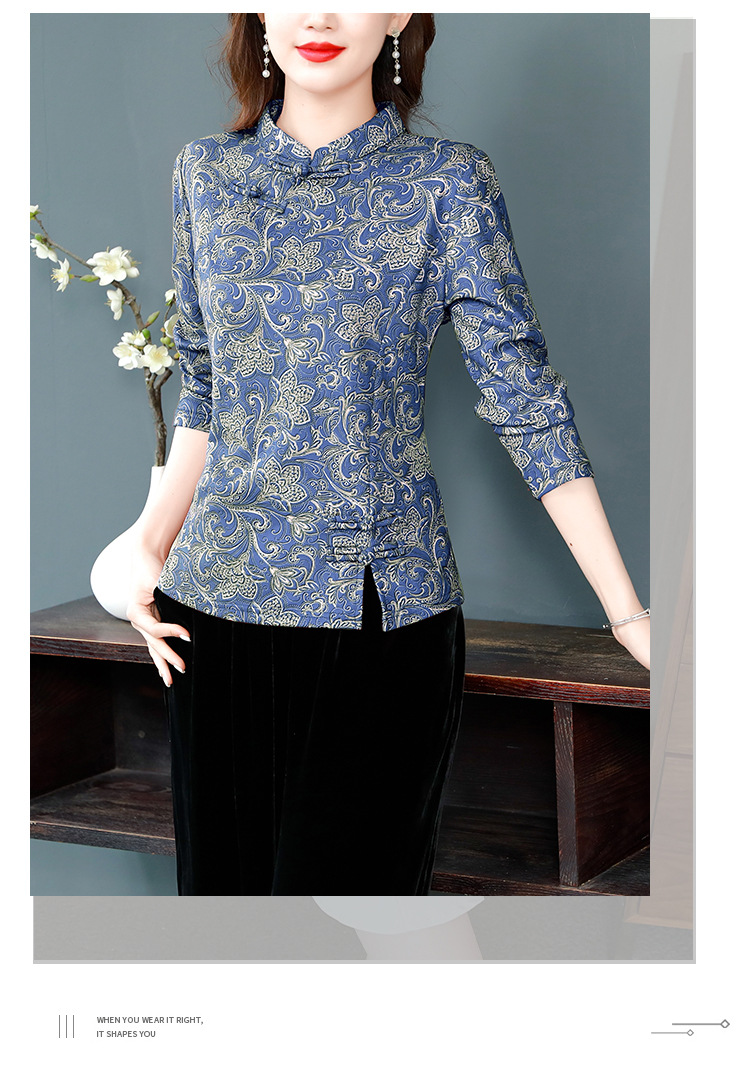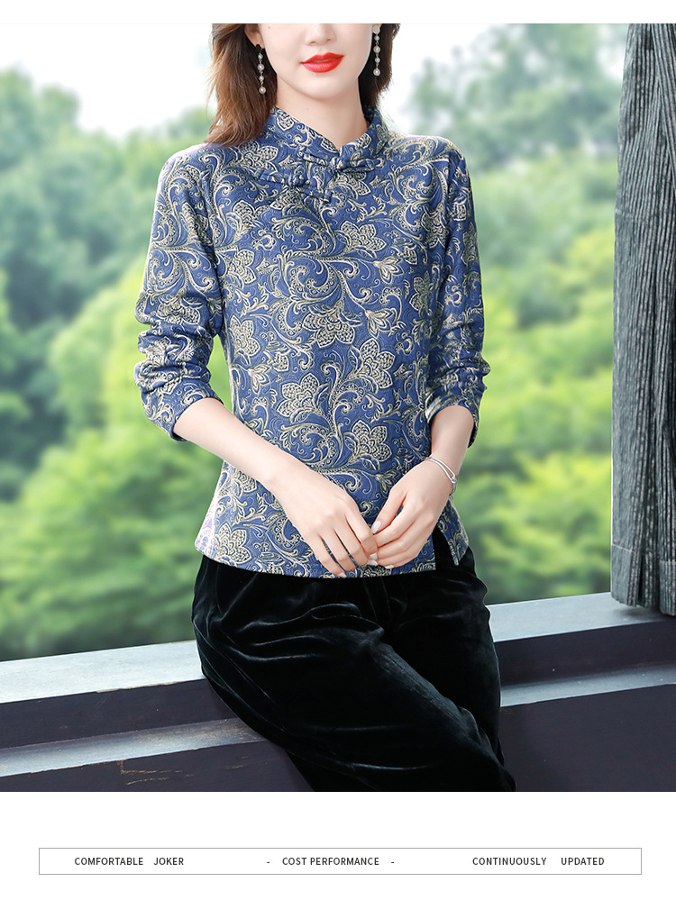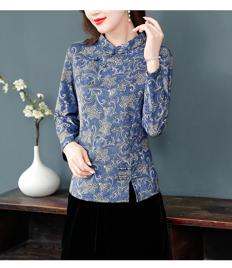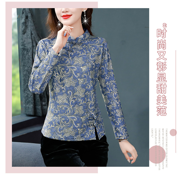 가을과 겨울 새로운 버클 긴 소매 레트로 블루와 화이트 도자기 드 벨벳 자카드 치파오 셔츠 티셔츠 어머니 플러스 사이즈 스트레치 탑