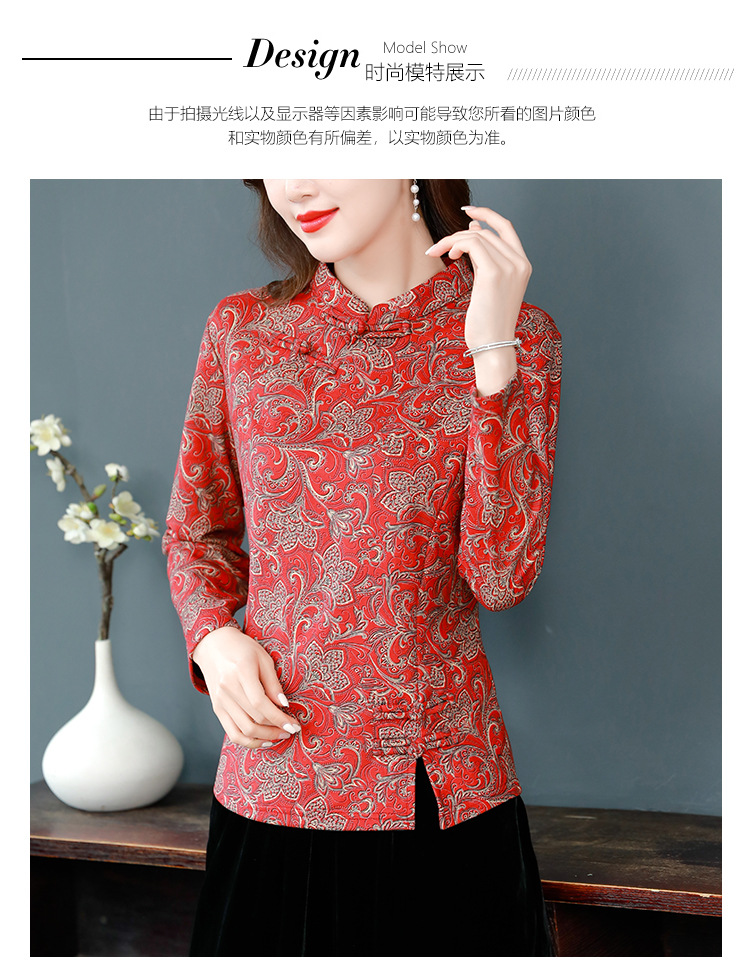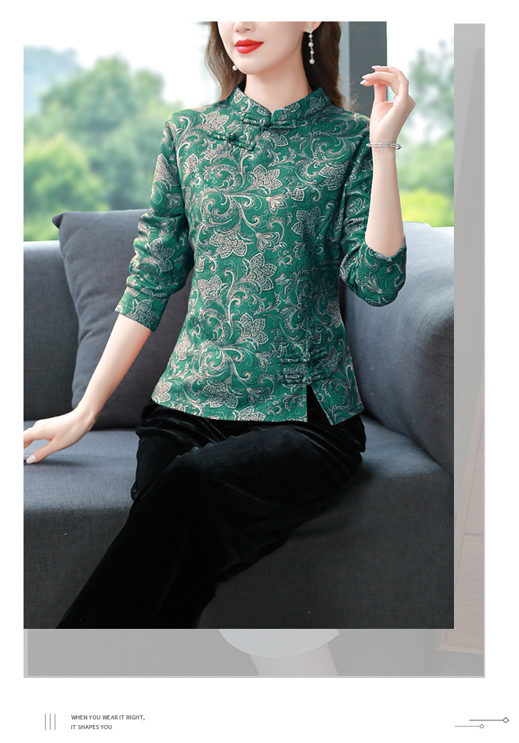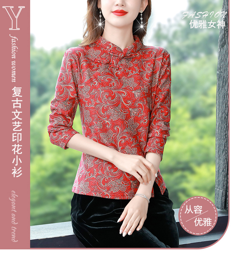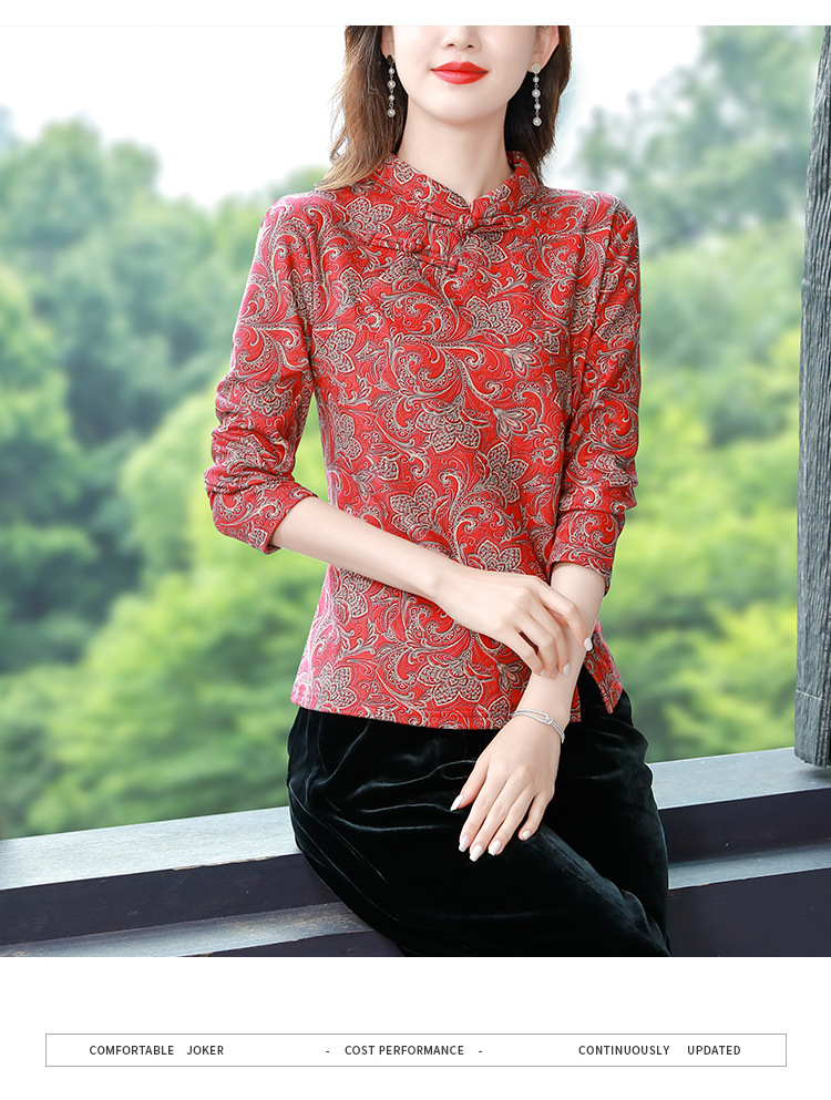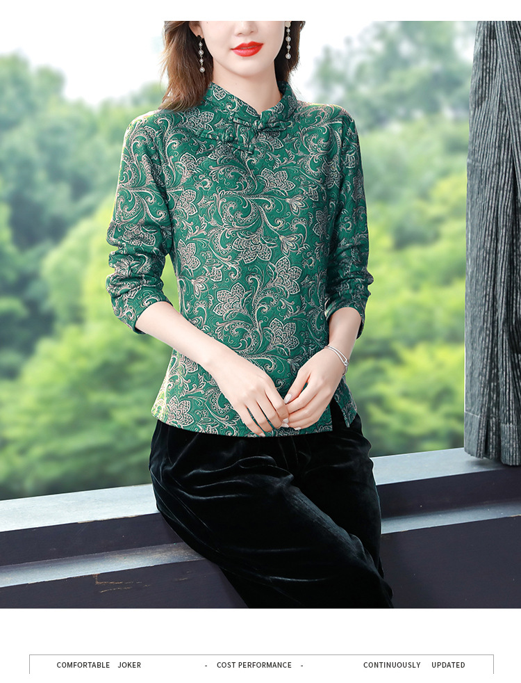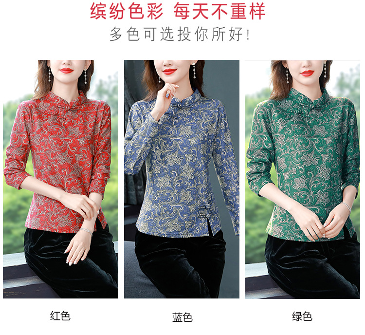 가을과 겨울 새로운 버클 긴 소매 레트로 블루와 화이트 도자기 드 벨벳 자카드 치파오 셔츠 티셔츠 어머니 플러스 사이즈 스트레치 탑