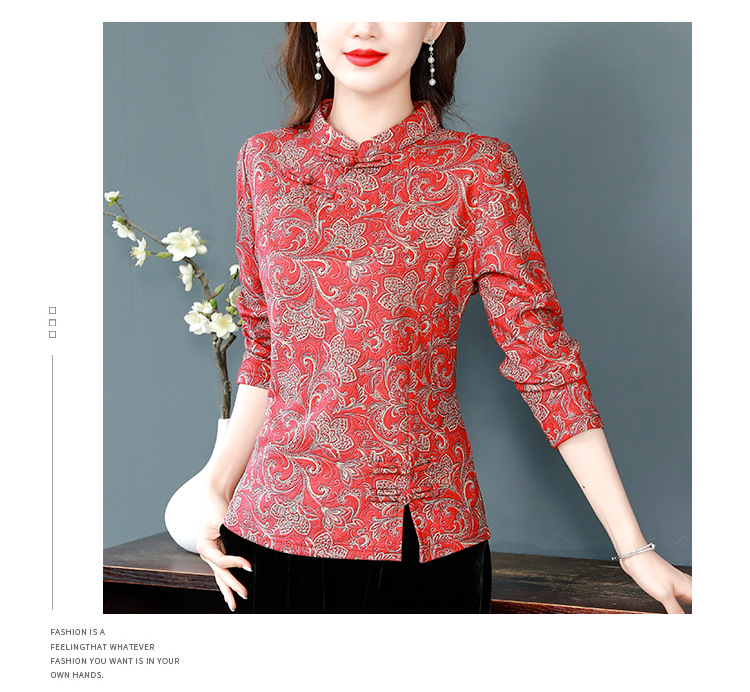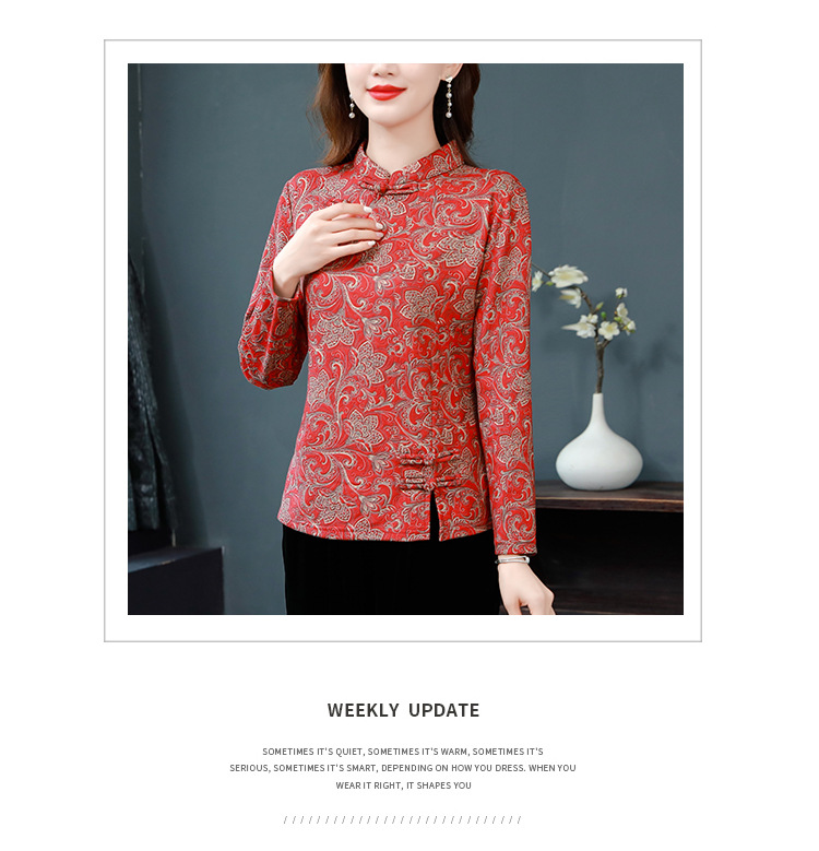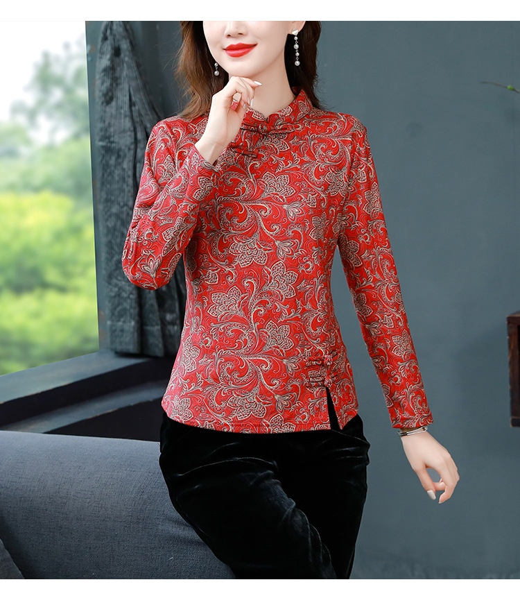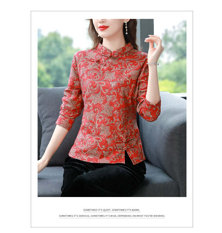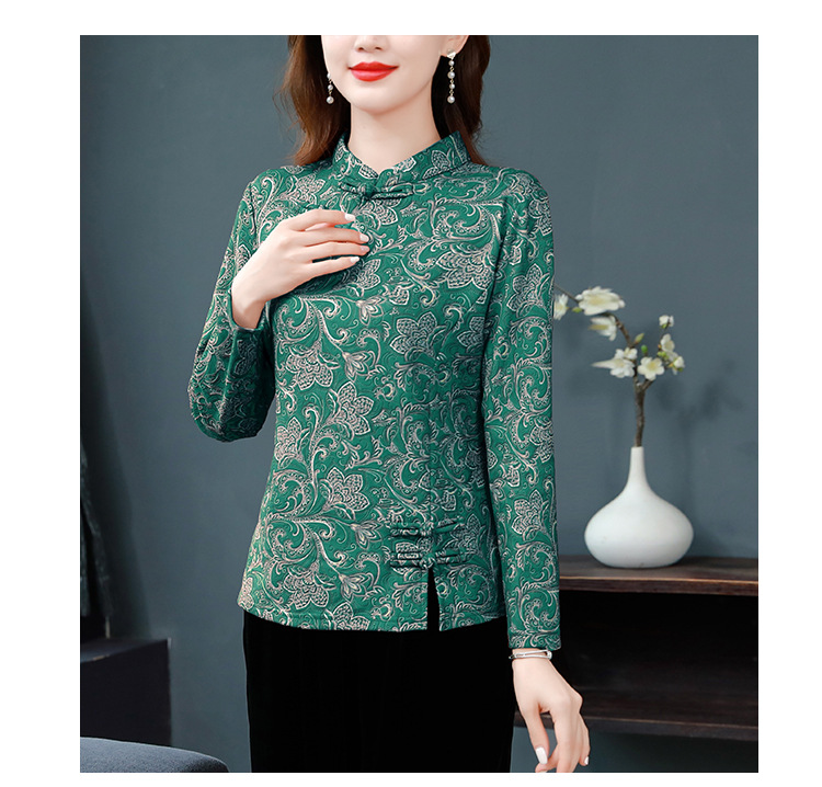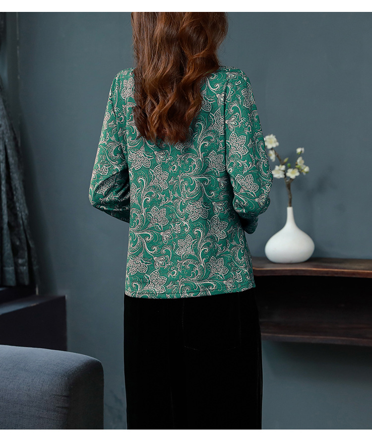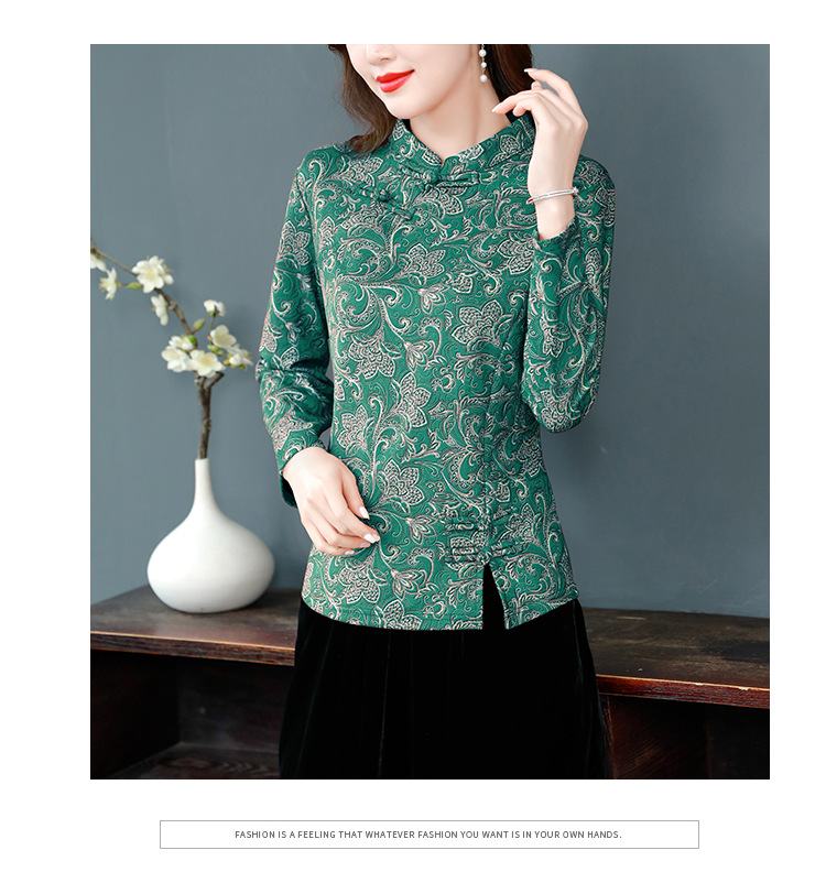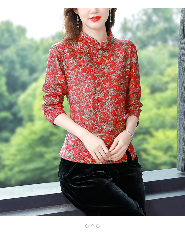 가을과 겨울 새로운 버클 긴 소매 레트로 블루와 화이트 도자기 드 벨벳 자카드 치파오 셔츠 티셔츠 어머니 플러스 사이즈 스트레치 탑