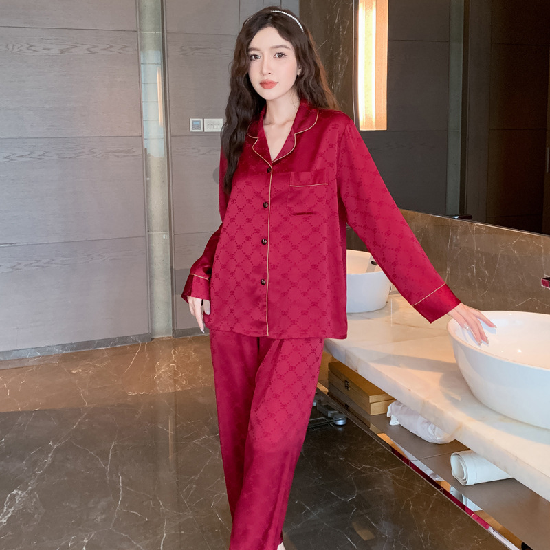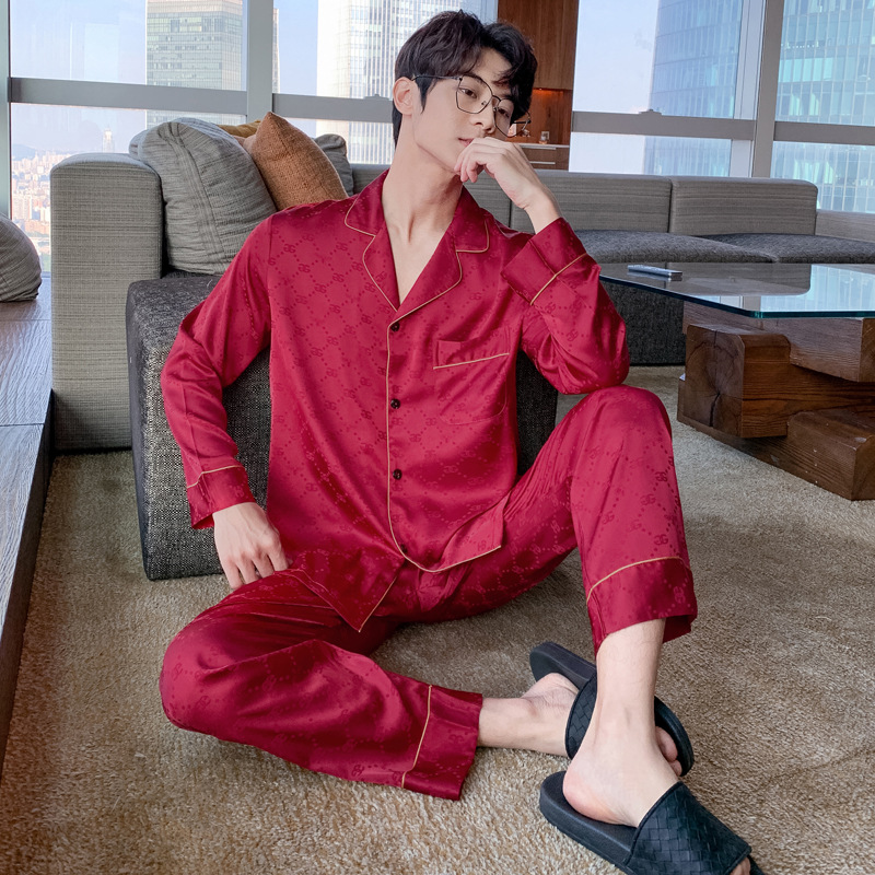 커플 잠옷 여자의 가을과 겨울 새로운 얼음 실크 긴 소매 세트 봄과 가을 남자의 빨간 결혼식 가정 옷스토어 가기
