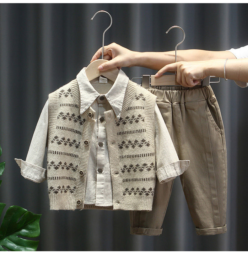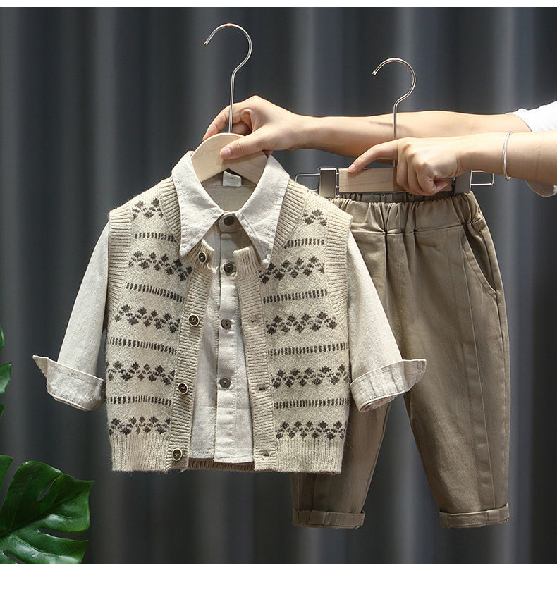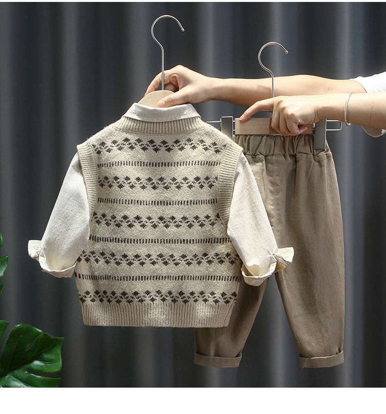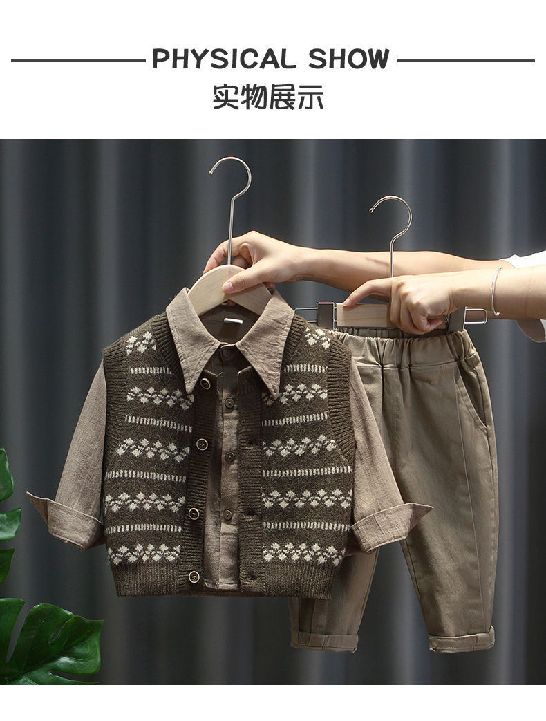 아기의 가을 세트 2023 새로운 소년 웨스턴 스타일 조끼 니트 쓰리 피스 세트 작은 어린이 봄과 가을 카디건 스웨터