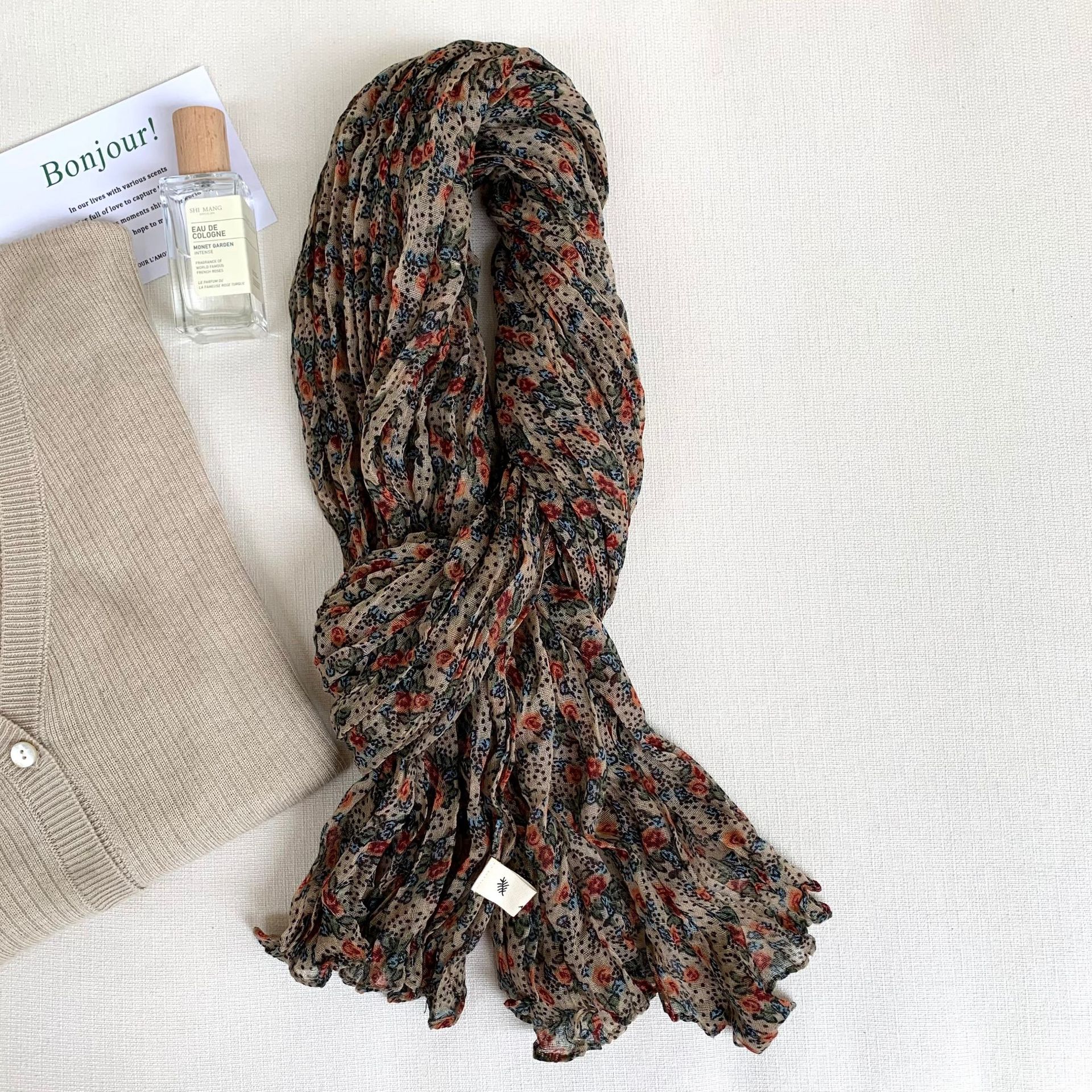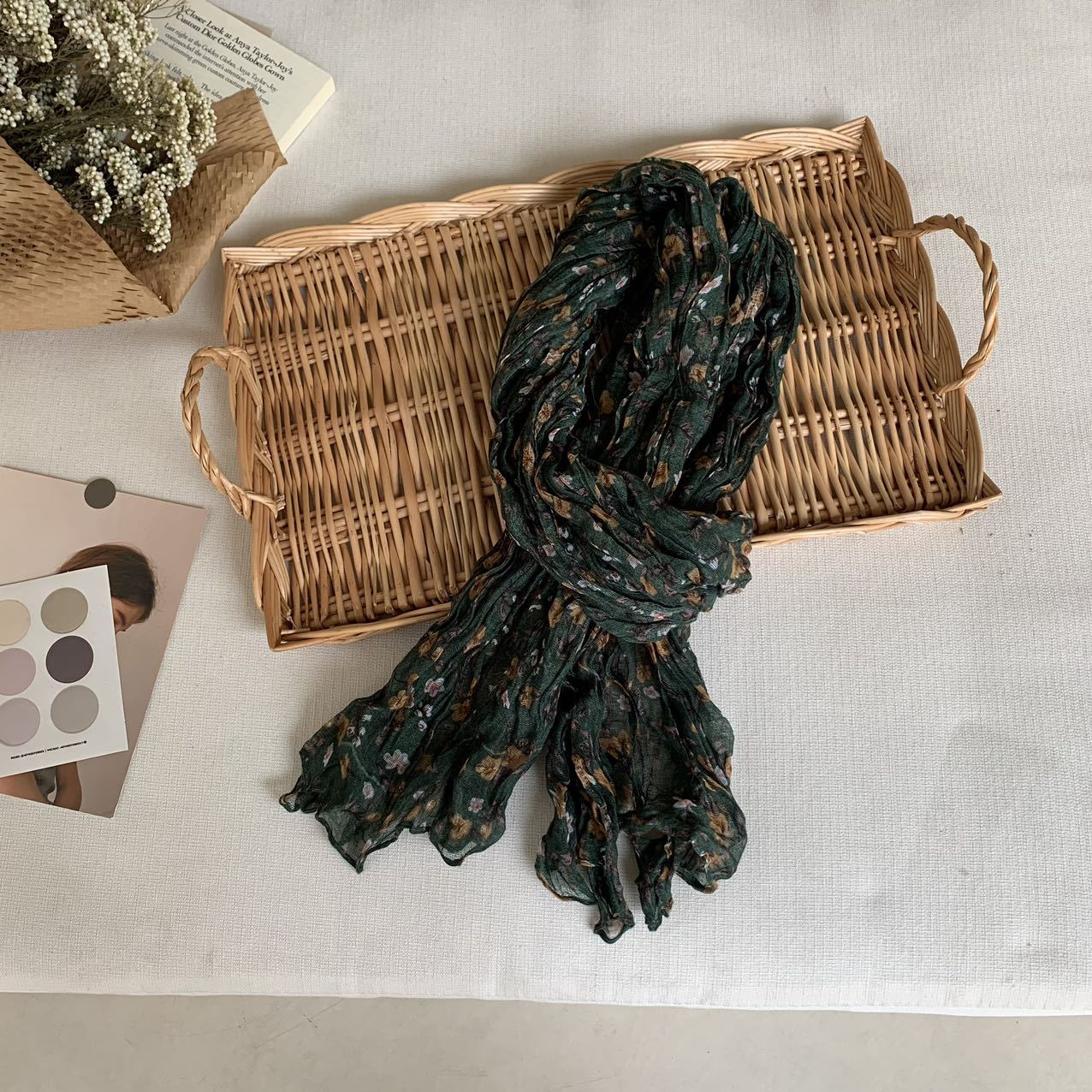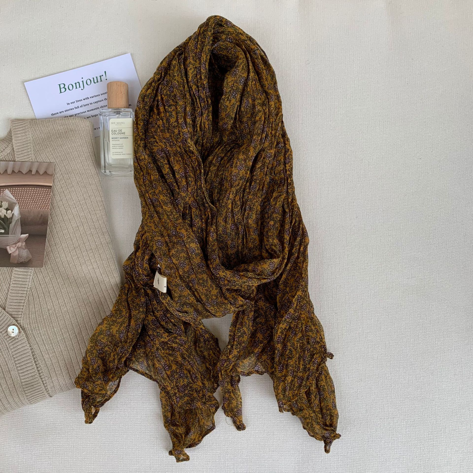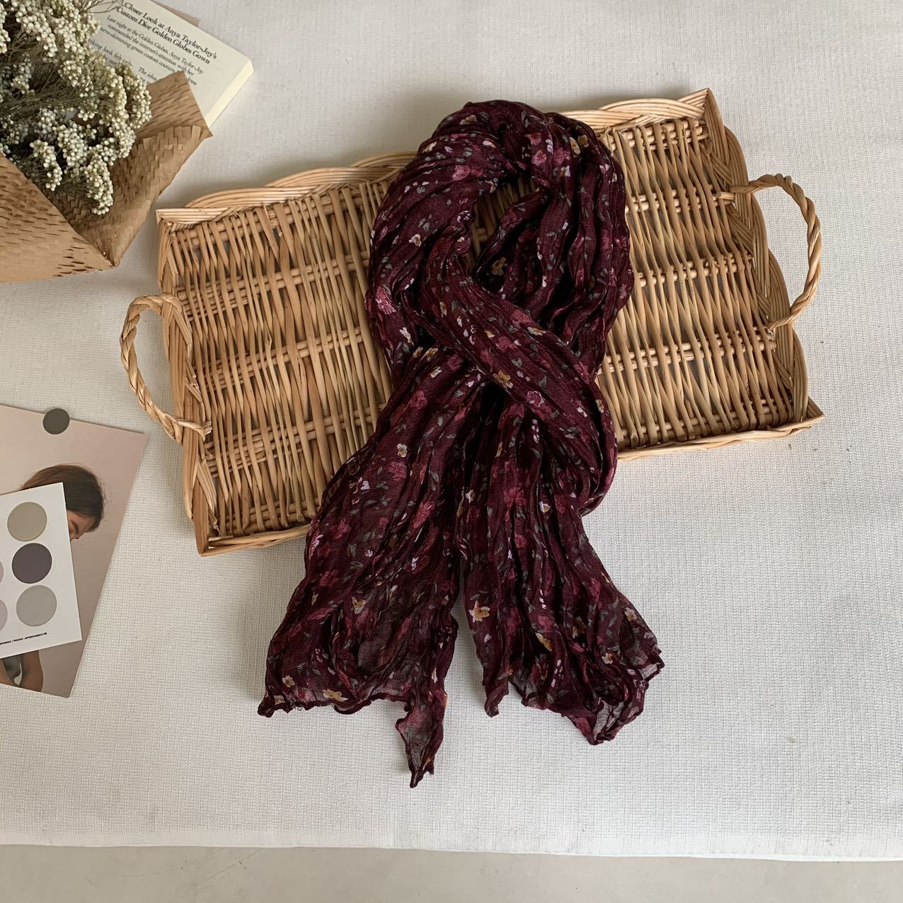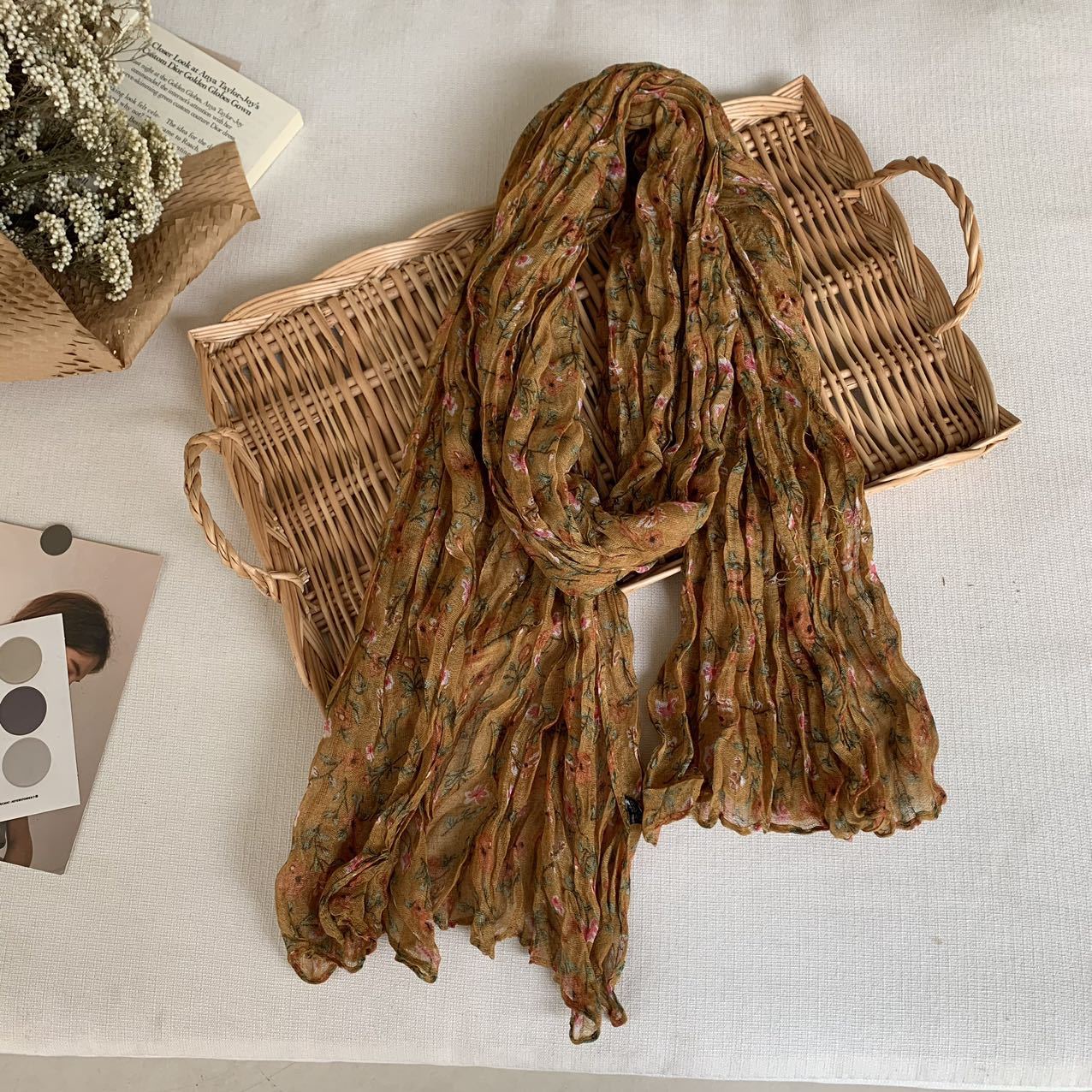 예술적 복고풍 부드러운 작은 꽃 복고풍 면과 린넨 스카프 여성의 여름 얇은 가을과 겨울 주름 긴 스카프 한국 스타일 실크 스카프