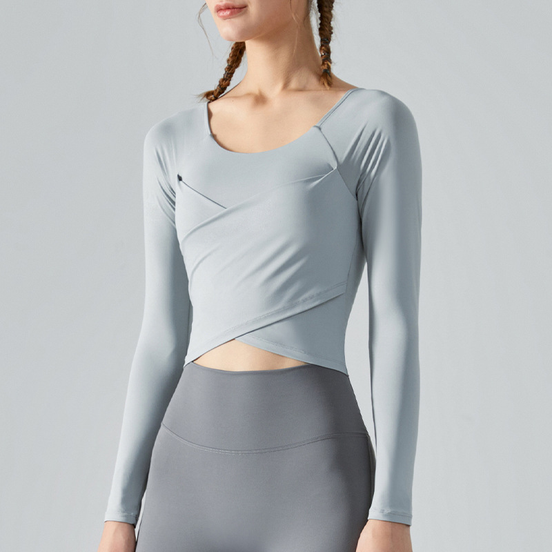 Ningbo Anjiu 가을 겨울 요가 의류 탑 가슴 패드 슬리밍 크로스 플리츠 슬림 핏 여성용 긴팔 스포츠 피트니스 의류