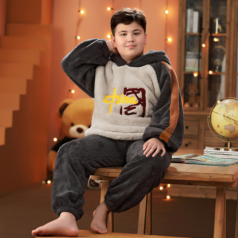 가을과 겨울에 소년을위한 뚱뚱한 아이들의 플란넬 잠옷 특대 두꺼운 산호 양털 가정 옷 세트스토어 가기