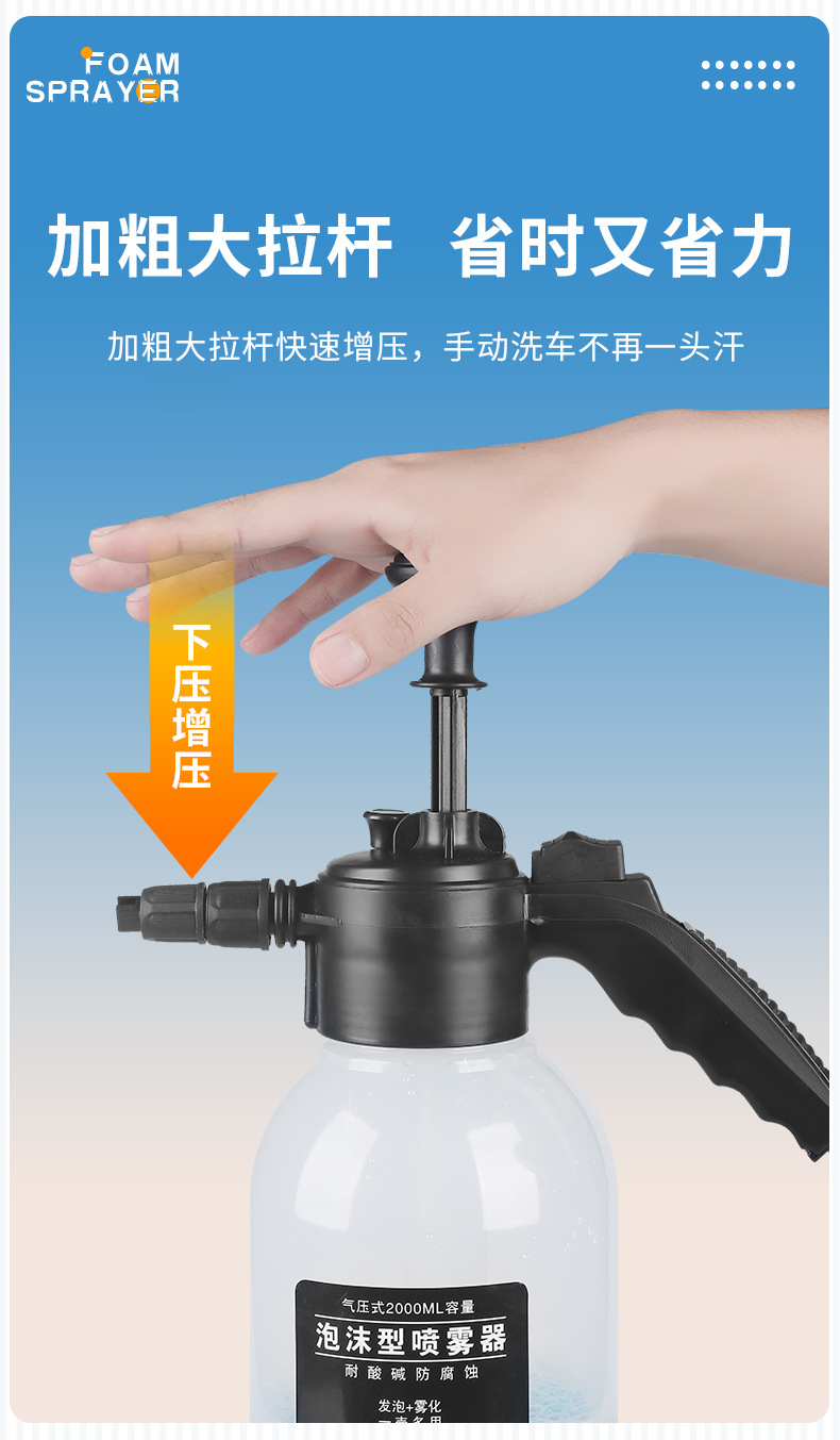 2、关于加压打气次数(有明显压力,按压手柄下压比较吃力)即停止加压,按压省力扣既可喷泡沫。