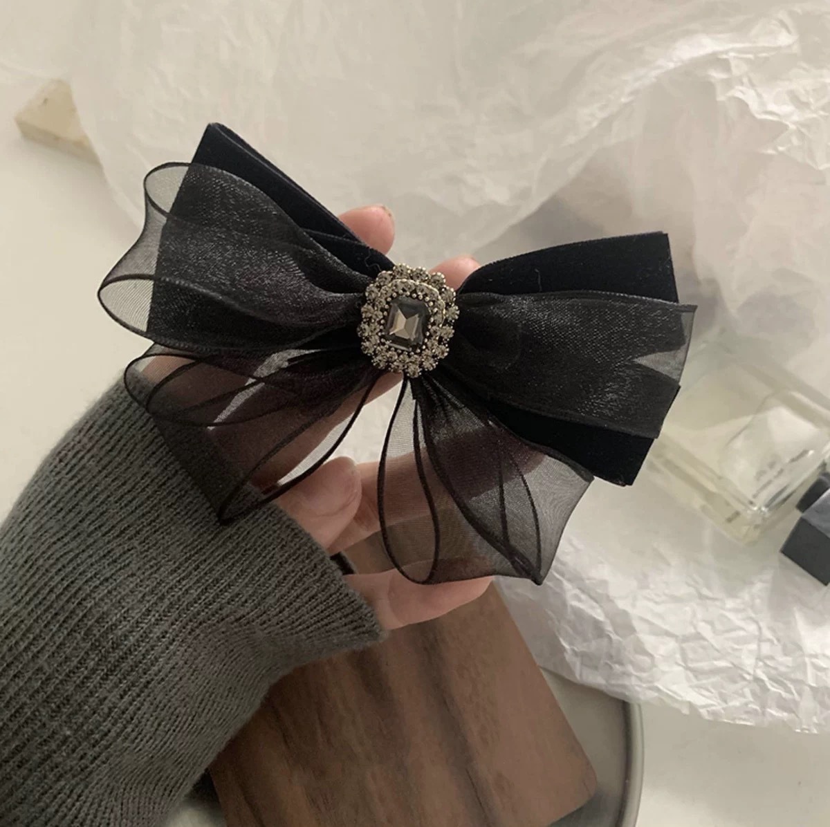 프랑스 스타일 슈퍼 페어리 라이트 럭셔리 라인 석 벨벳 활 머리핀 고급 백 헤드 탑 로우 포니테일 스프링 클립 헤어 액세서리