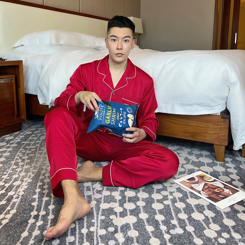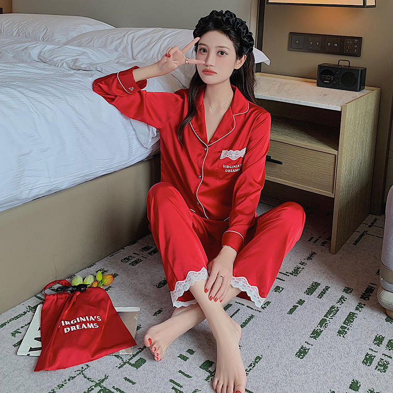 빨간 축제 커플 잠옷 세트 레이스 레이스 여자 얼음 실크 세트 자수 남자의 가정 옷 선물스토어 가기