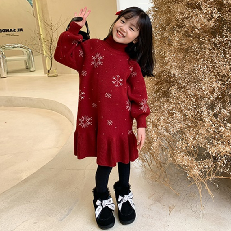 여아용 2026 가을 겨울 하이넥 스웨터 드레스 아기 드레스 어린이용 세련된 니트 스웨터 눈꽃 무늬 롱 스커트 두꺼운 소재스토어 가기