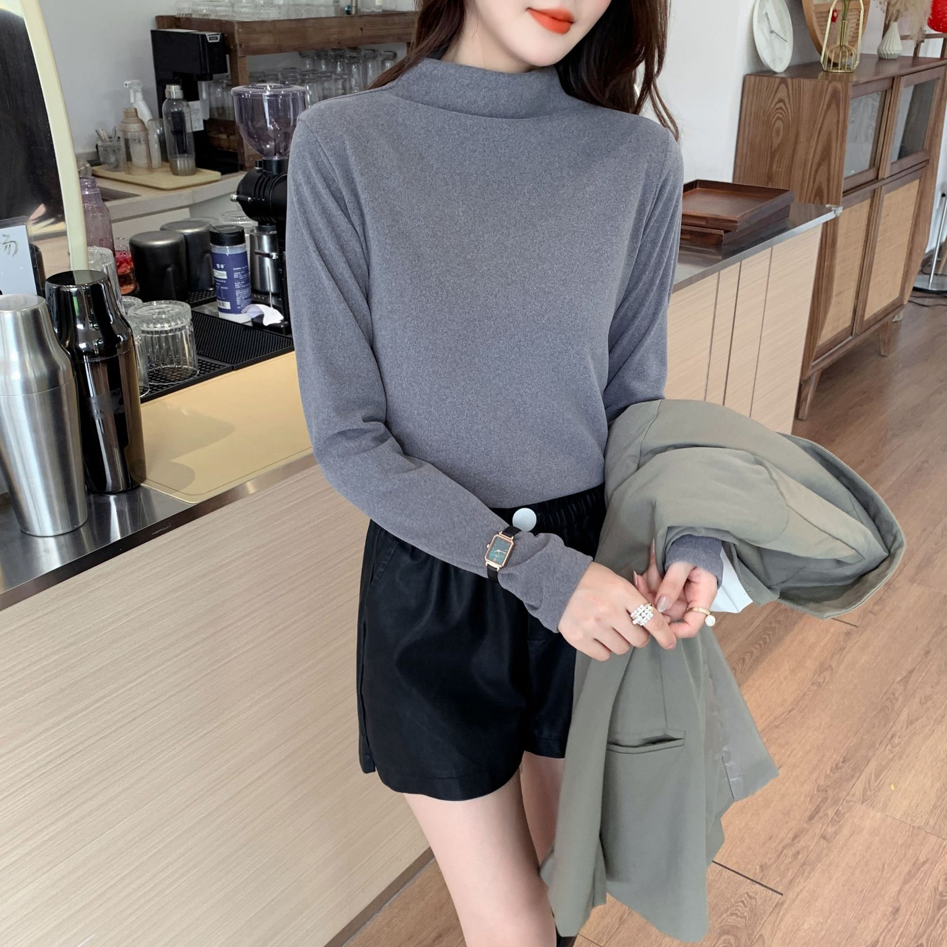양면 벨벳 베이스 셔츠 여성용 가을과 겨울 샌딩 세미 하이 칼라 긴 소매 두꺼운 따뜻한 슬림 핏 올 매치 탑 여성용