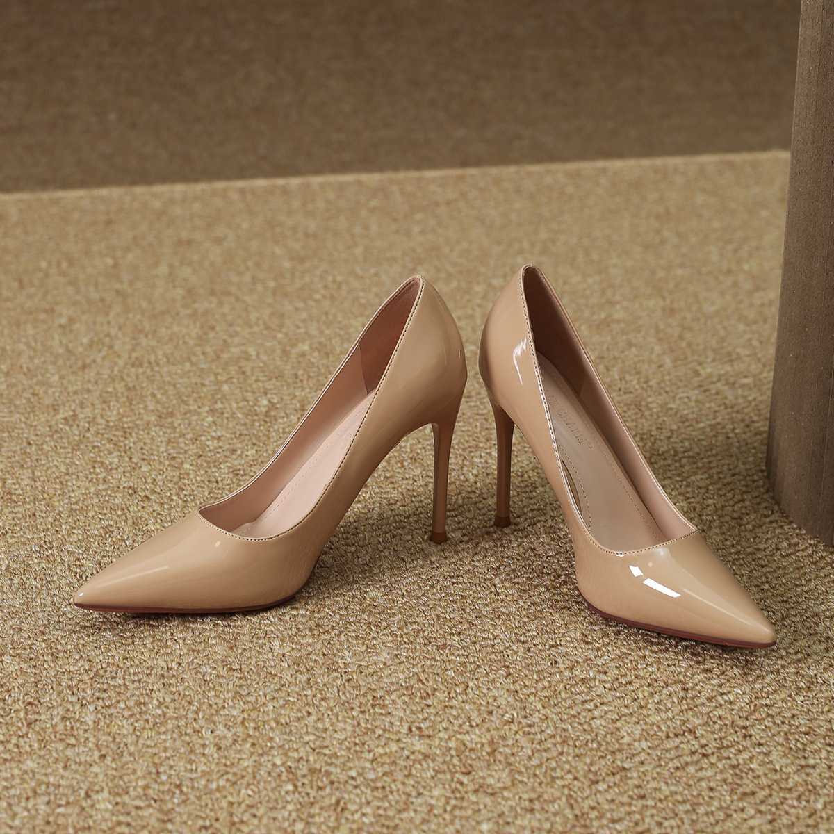 누드 하이힐 여성용 2023 새로운 모든 매치 스틸레토 힐 우아한 섹시한 뾰족한 얕은 입 에나멜 가죽 전문 프랑스 스타일 신발스토어 가기