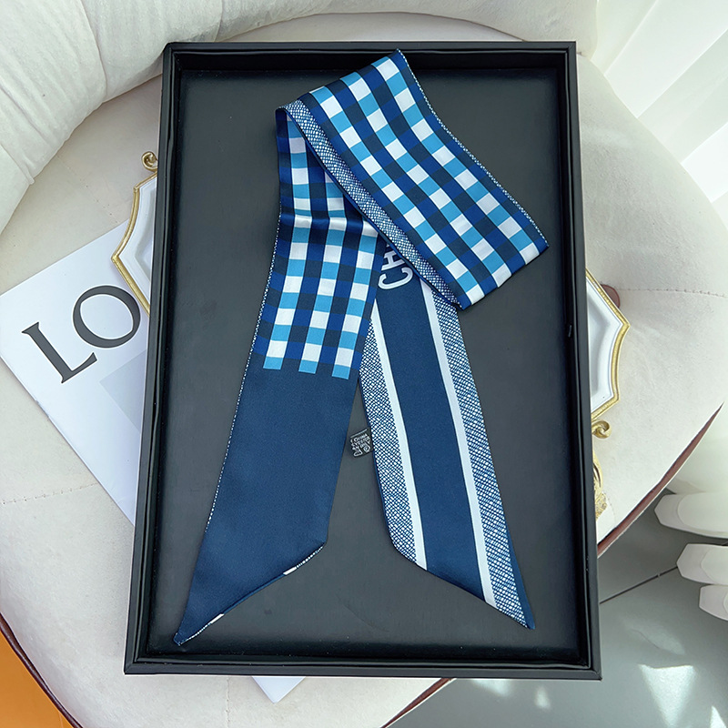 새로운 간단한 파란색 격자 무늬 기하학적 패턴 긴 경 사진 실크 스카프 유럽과 미국 프랑스 헤어 밴드 모든 매치 넥 리본