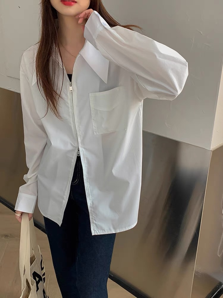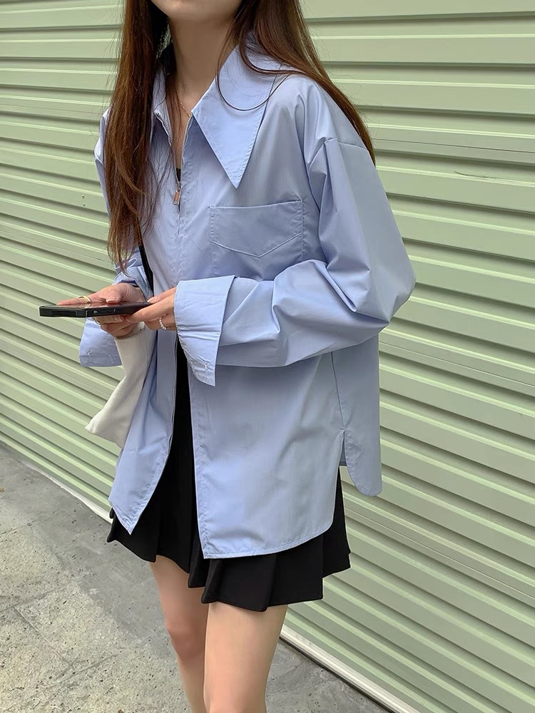 한국 스타일 루즈핏 상의 2022 가을 신상 디자인 감각적인 틈새시장 더블 지퍼 솔리드 컬러 긴팔 셔츠 캐주얼하고 다재다능함스토어 가기