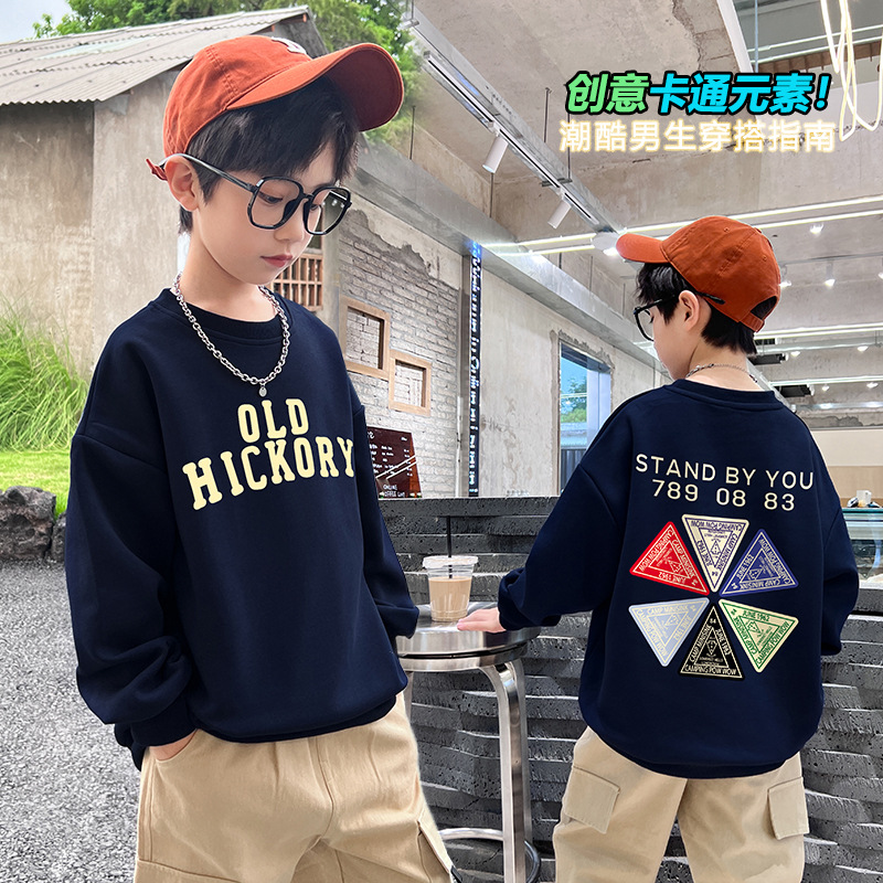 진짜 샷 가을과 겨울 기모 소년 '운동복 긴 소매 느슨한 만화 인쇄 라운드 넥 잘 생긴 중간 큰 어린이의 봄과 가을 탑스토어 가기