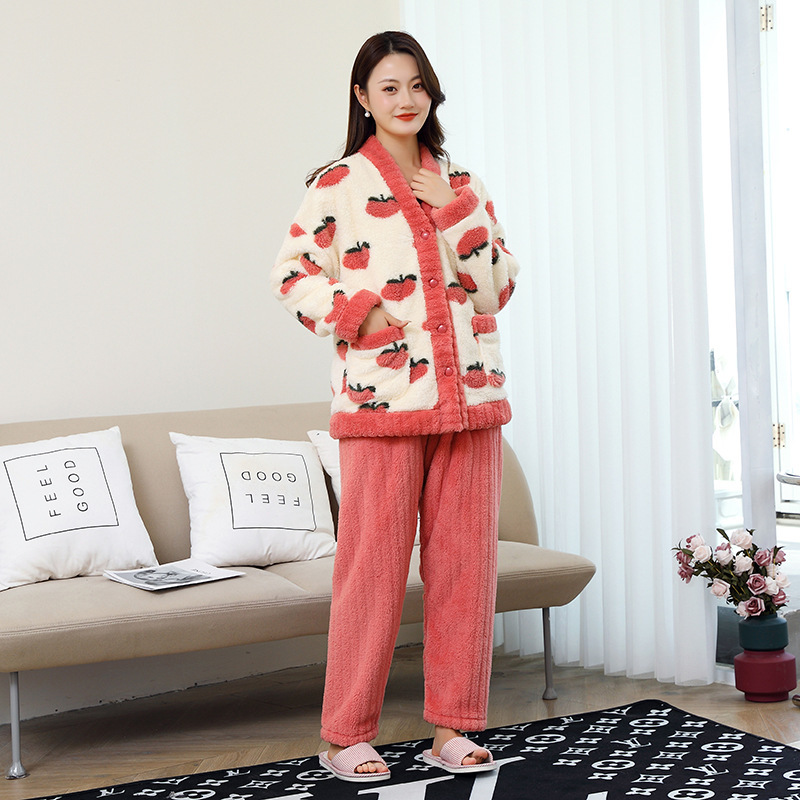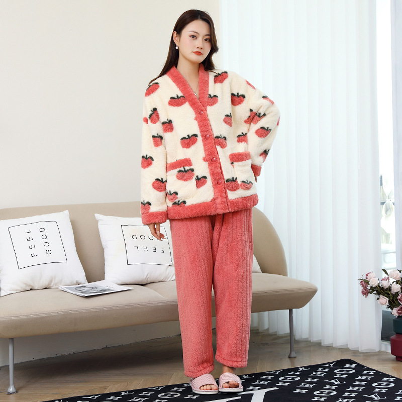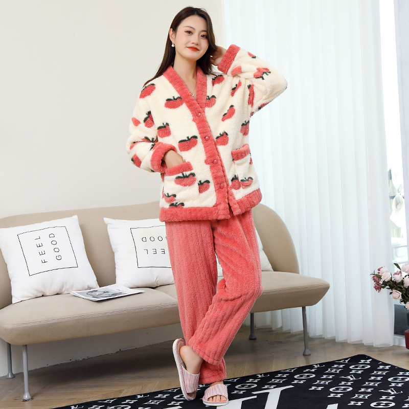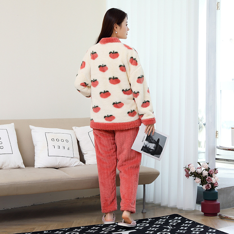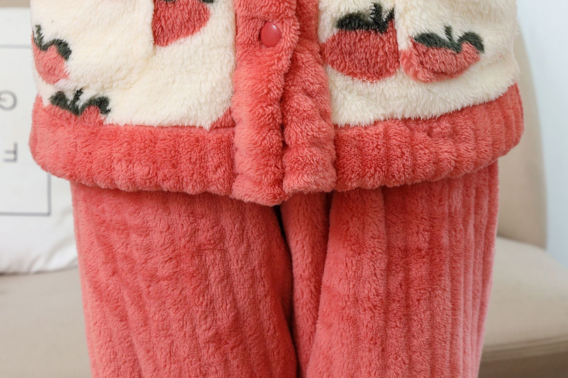 엄선된 플러시 우롱 복숭아 잠옷 여성용 겨울 루즈핏 따뜻한 복숭아 잠옷 플란넬 프린트 따뜻한 세트