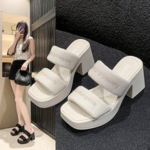 水钻厚底一字凉拖鞋女2024夏季新款时尚粗跟增高外穿拖鞋高跟凉鞋