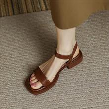 2024春季新款一字式扣带罗马凉鞋露趾圆头平跟休闲厚底编织凉鞋女