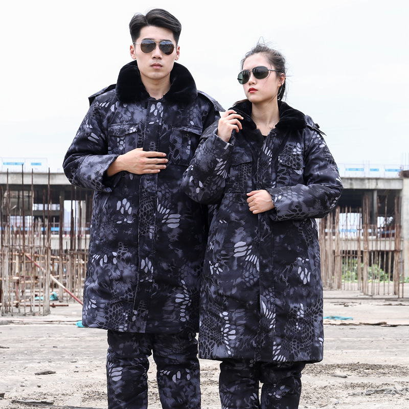 다크 나이트 위장 밀리터리 코튼 코트 남성용 겨울 두꺼운 방한 면 패딩 재킷 길어진 동북 대형 면 패딩 재킷 보안 보호 의류스토어 가기