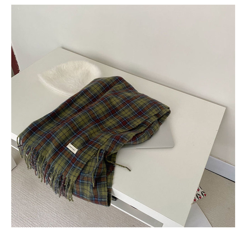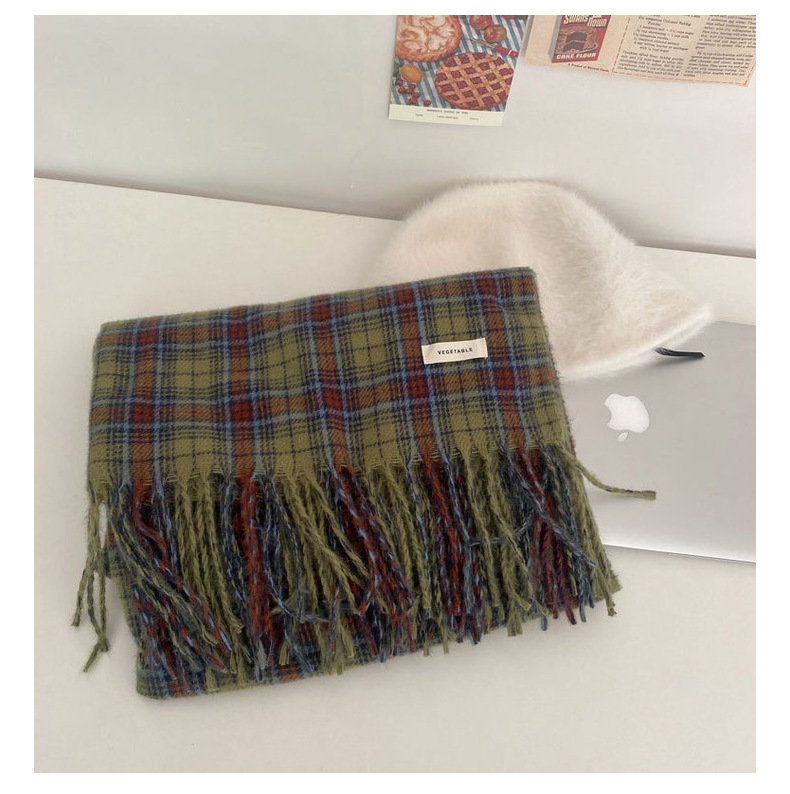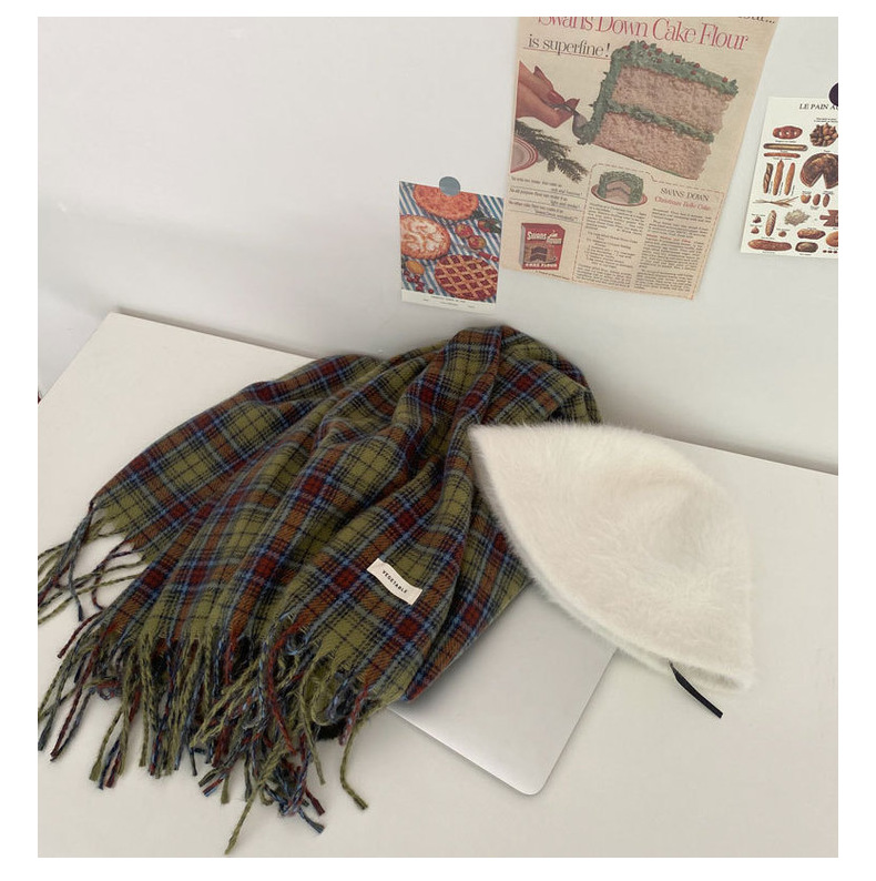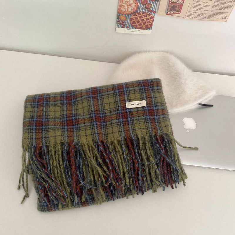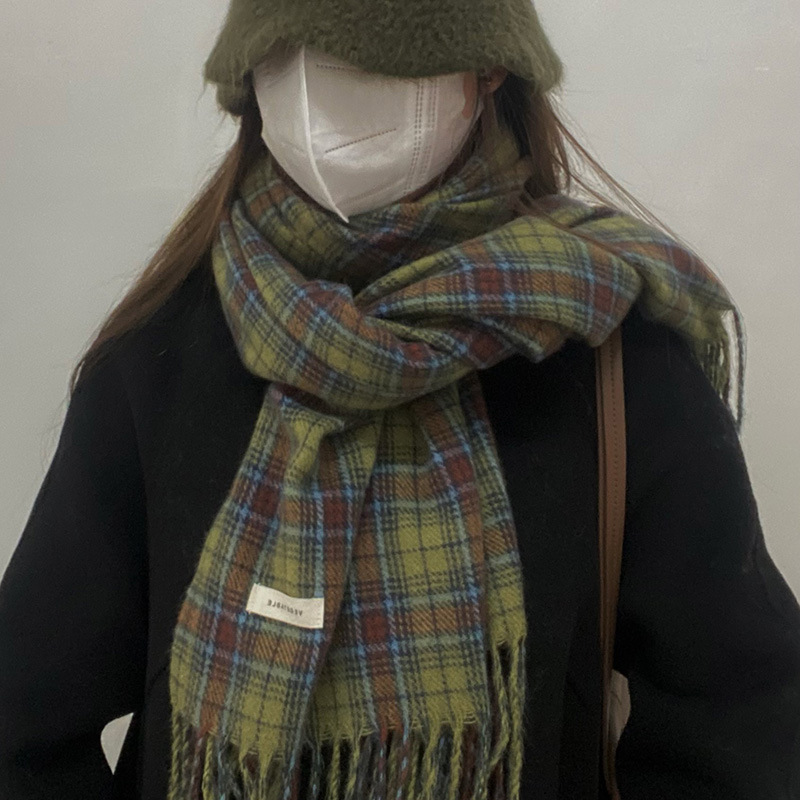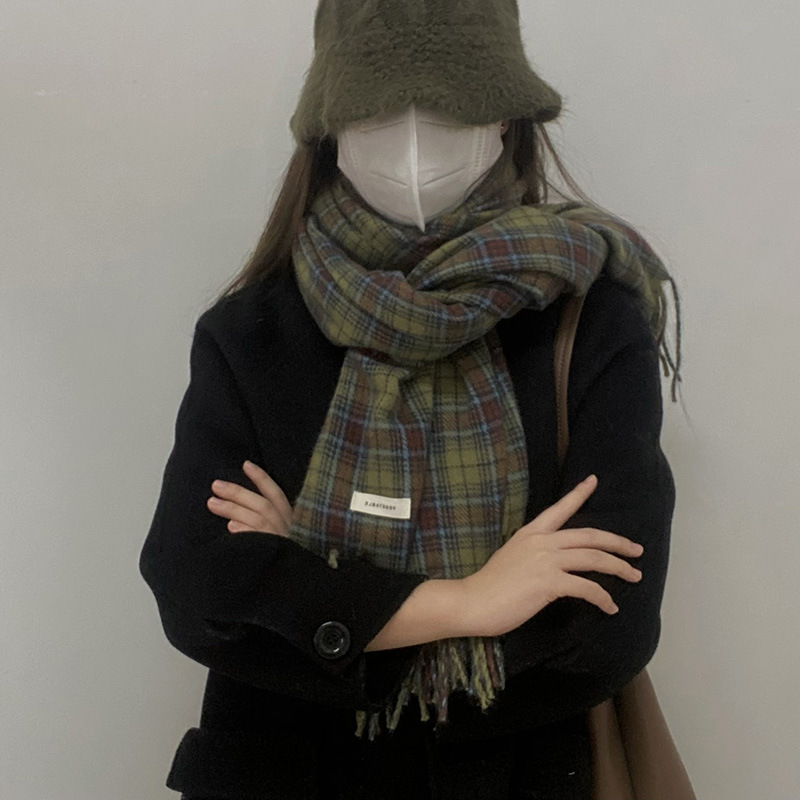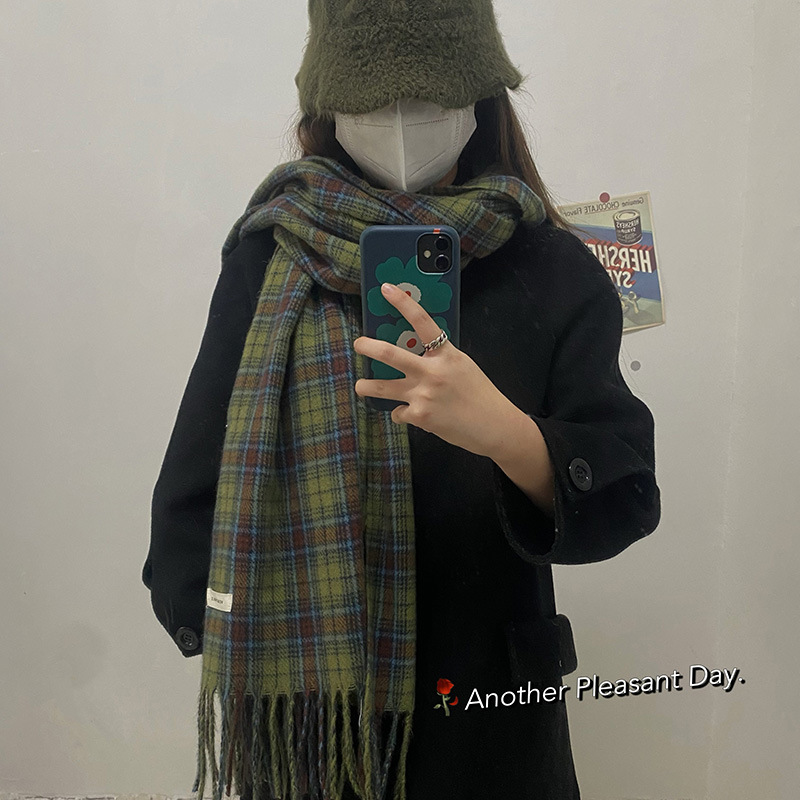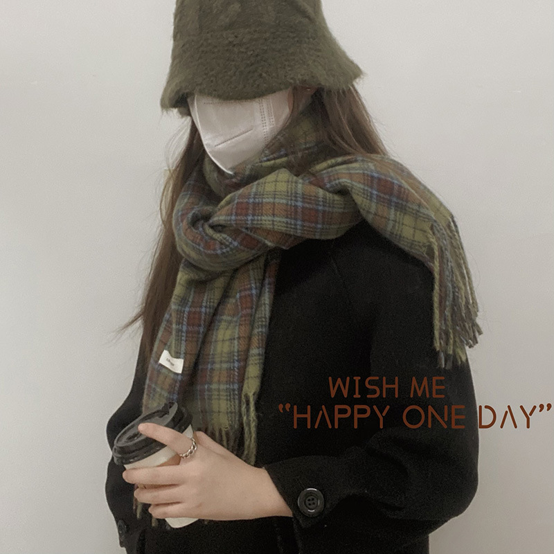 * 피클 그린 * 레트로 그린 격자 무늬 스카프 여성의 겨울 성격 고급 감각 따뜻한 숄 스카프 한국 스타일 새로운 스타일