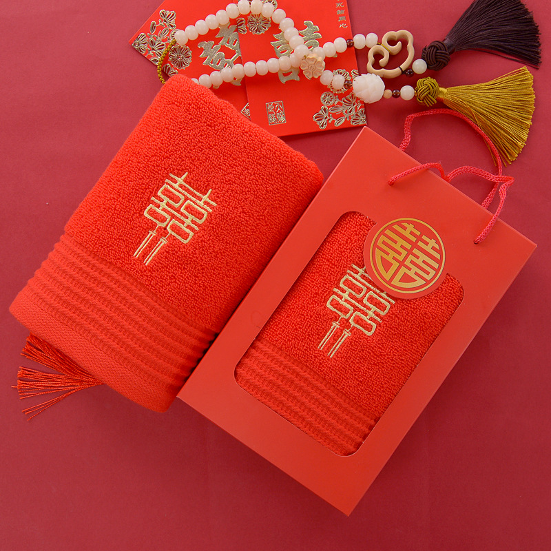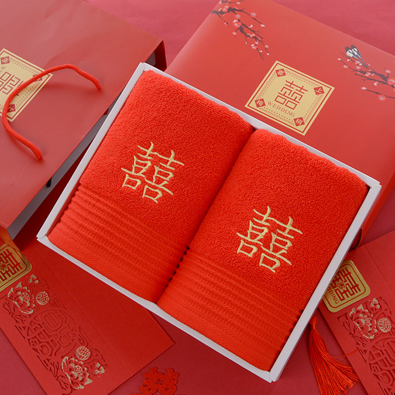 면 빨간 수건 한 쌍의 행복한 단어 자수가 퇴색하지 않습니다 머리 빨간 선물 상자 결혼 동반자 선물 상자