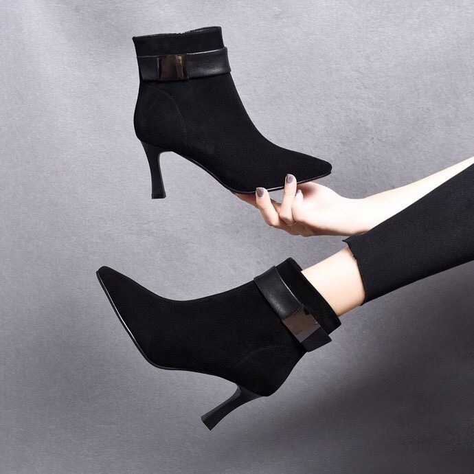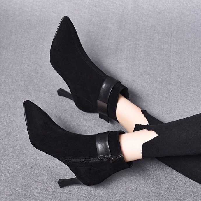 하이힐 패션 부츠 여성용 2023 가을과 겨울 새로운 유럽과 미국 스타일 뾰족한 작은 알몸 부츠 탑 레이어 소가죽 양가죽 우아한 발목 부츠스토어 가기