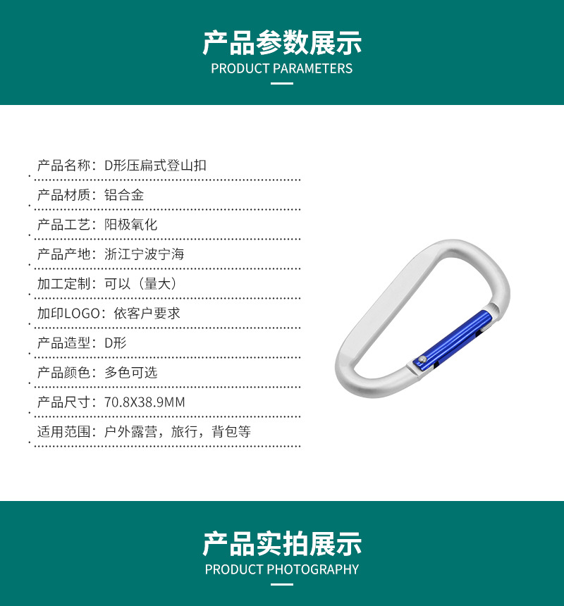 本公司是一家设计及制造铝合金登山扣生产加工型工厂,主要产品有D形登山扣、异形登山扣、葫芦形登山扣、带锁登山扣、螺母登山扣等产品,公司拥有完整、科学的质量管理体系,与很多外贸企业都有合作并建立长期合作的贸易关系。