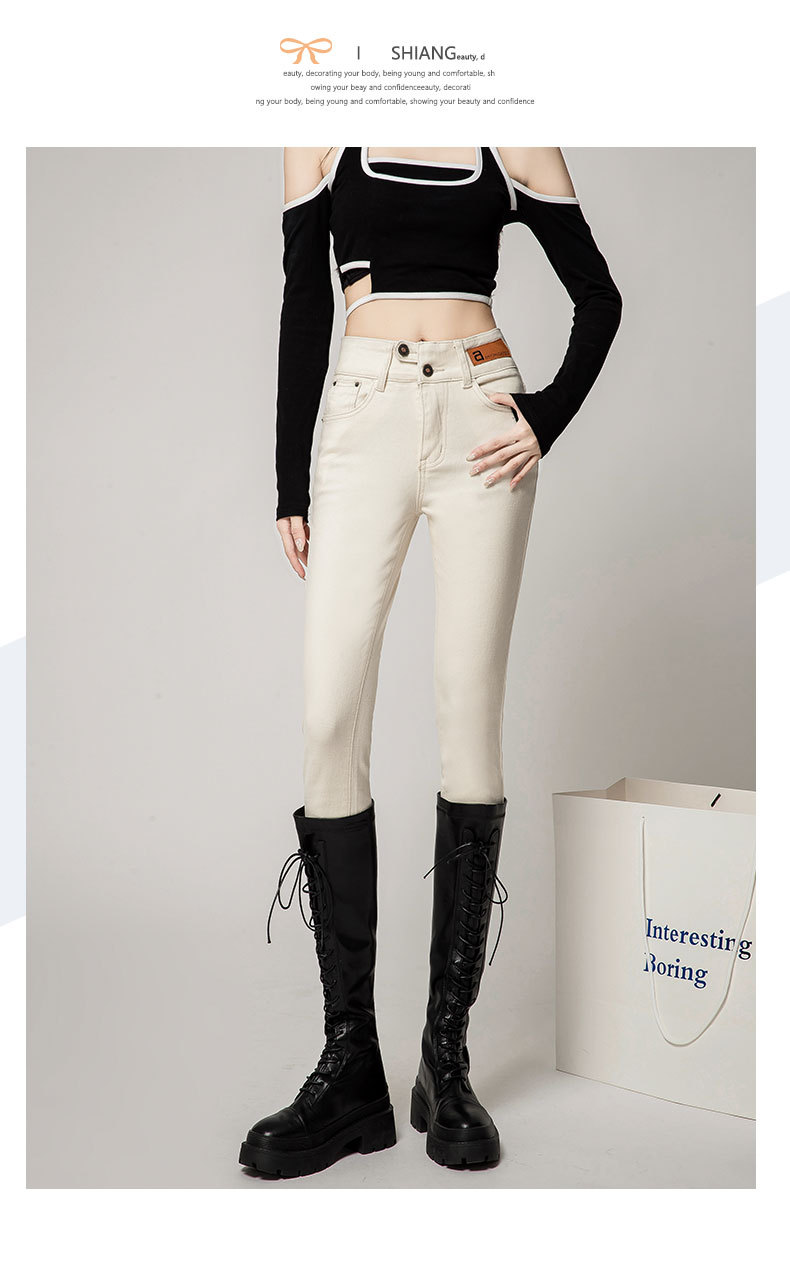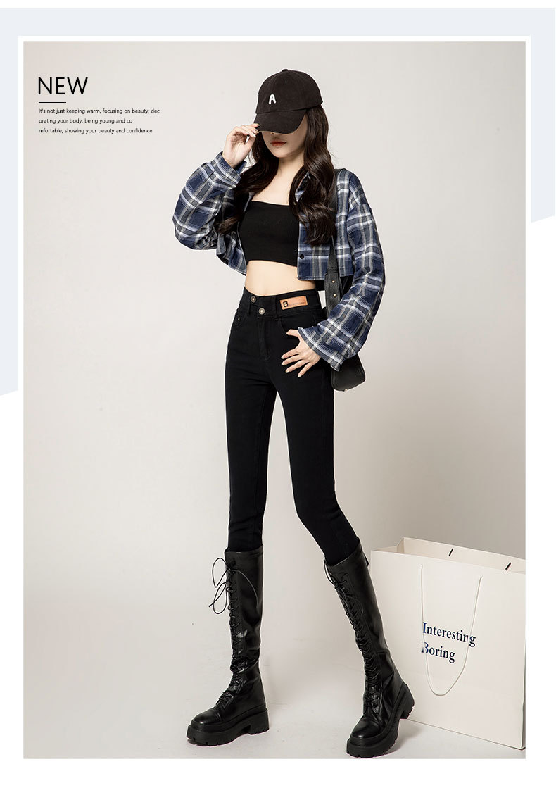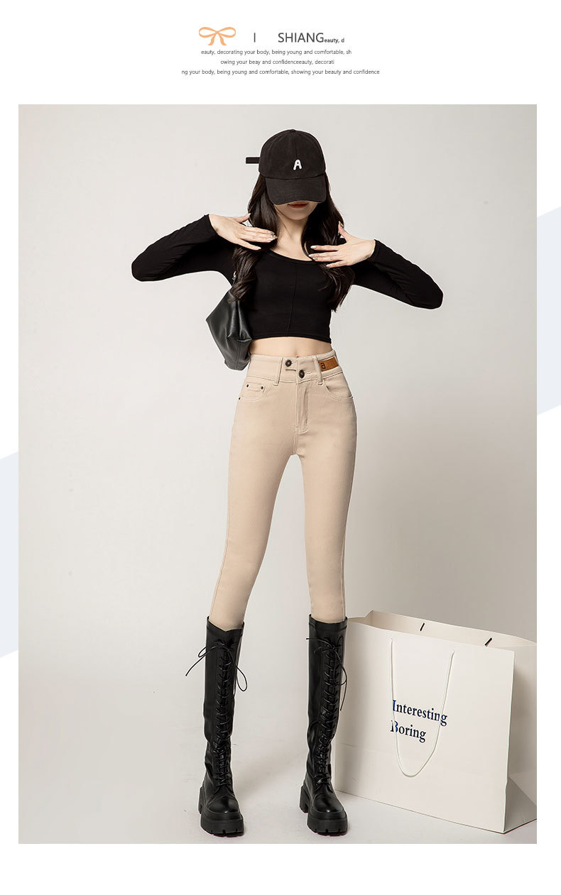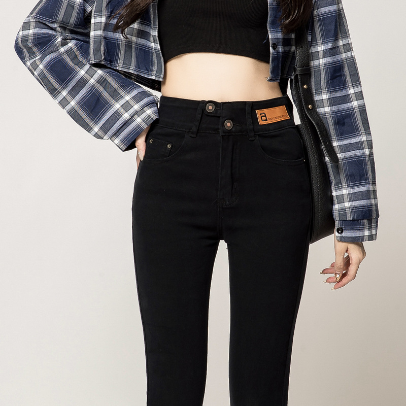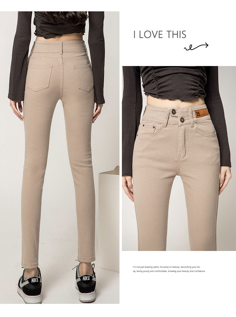 하이 웨이스트 잘못 배치 버튼 겉옷 청바지 여자의 가을과 겨울 새로운 기모 두꺼운 폭발 슬림 핏 슬리밍 연필 바지스토어 가기