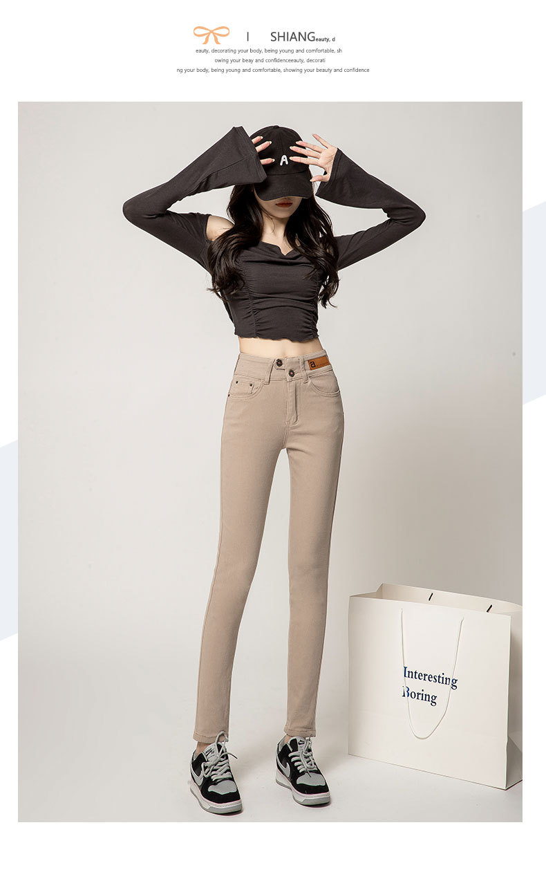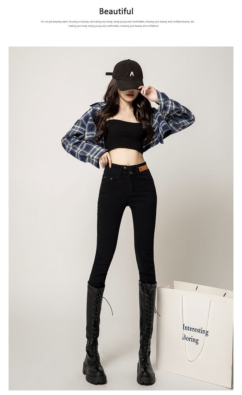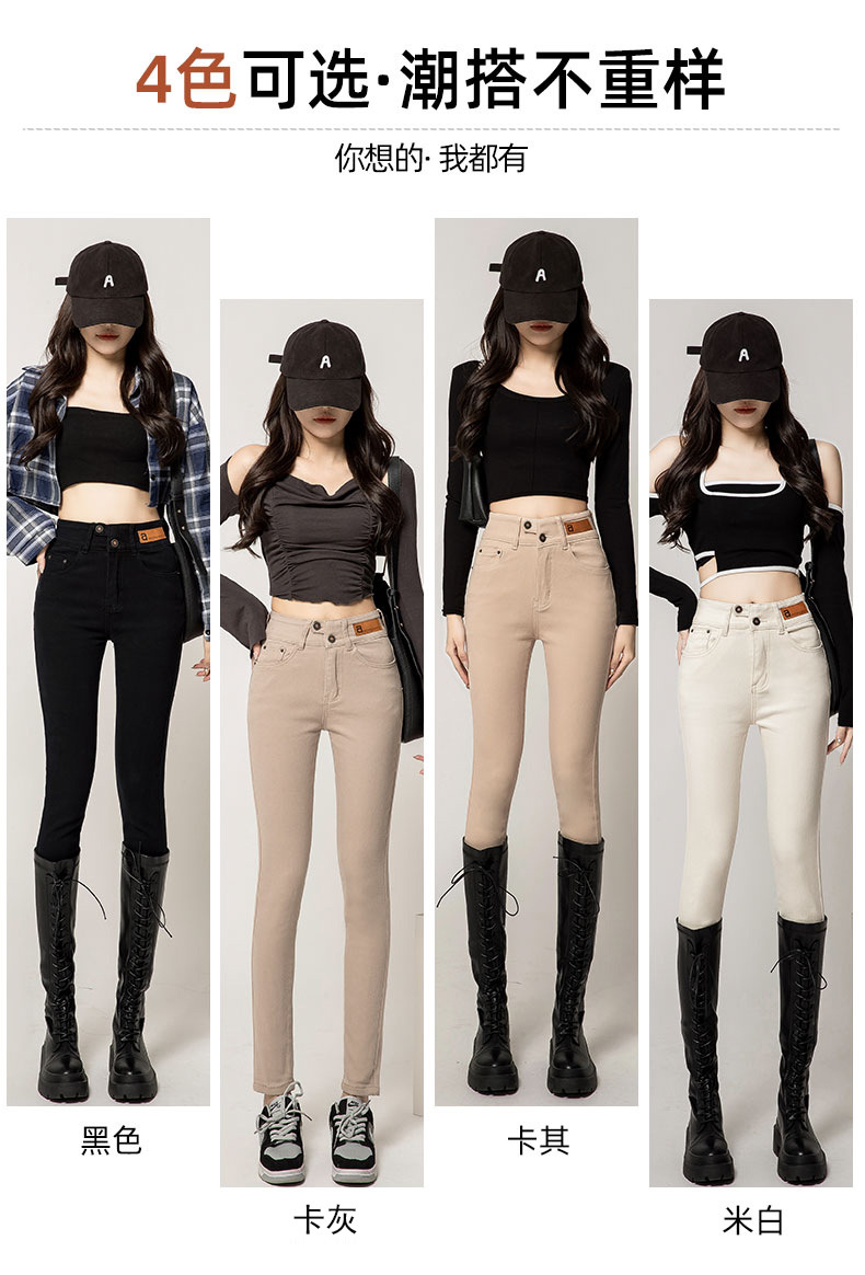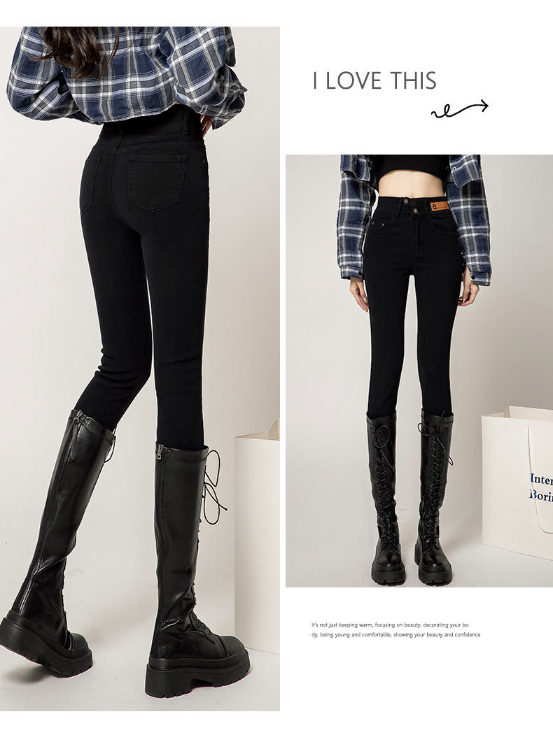 하이 웨이스트 잘못 배치 버튼 겉옷 청바지 여자의 가을과 겨울 새로운 기모 두꺼운 폭발 슬림 핏 슬리밍 연필 바지스토어 가기