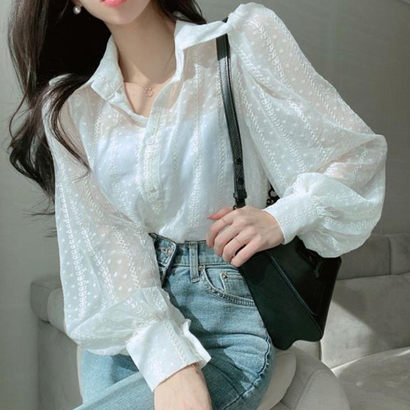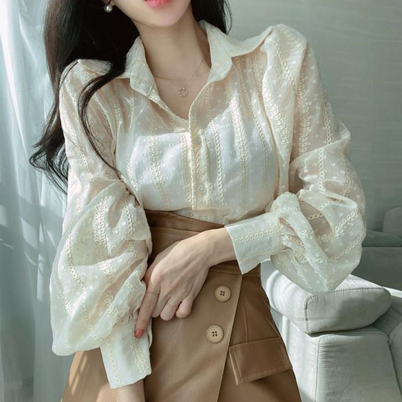 한국 세련된 가을 우아한 옷깃 중공업 입체 크로 셰 뜨개질 느슨한 마이크로 투명 버블 슬리브 셔츠 탑 여성용스토어 가기