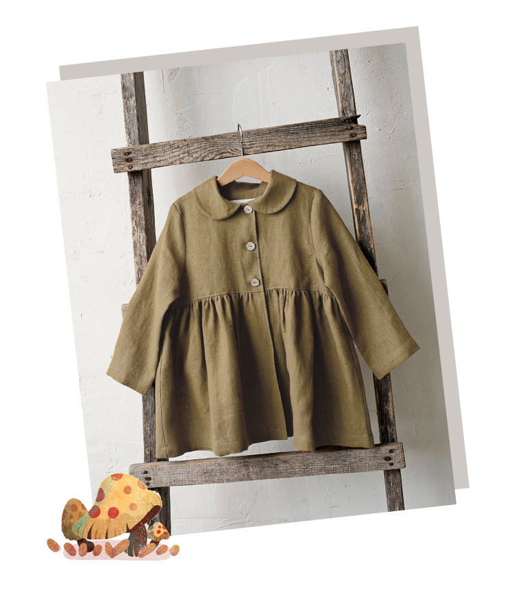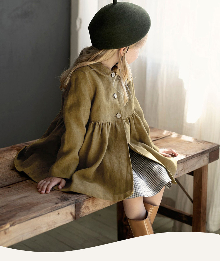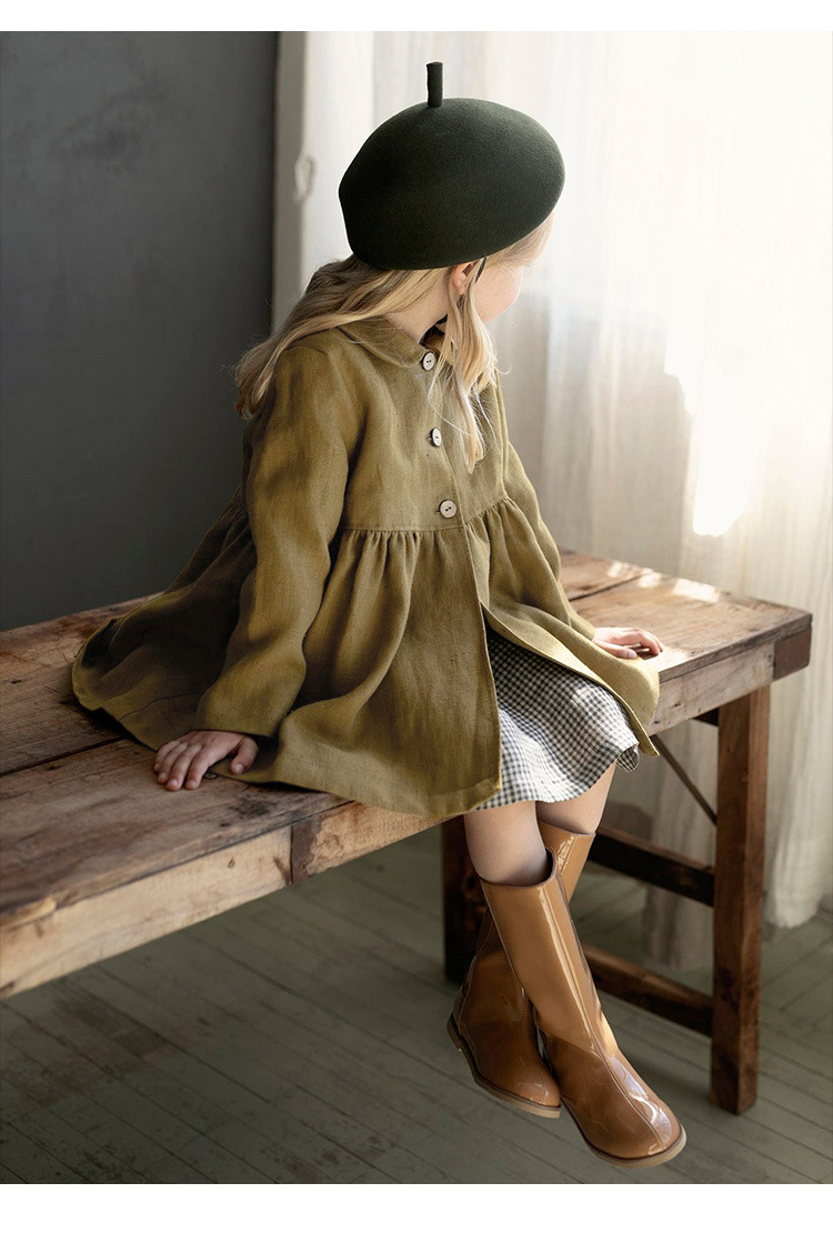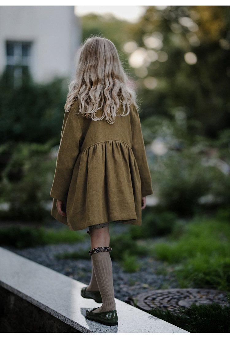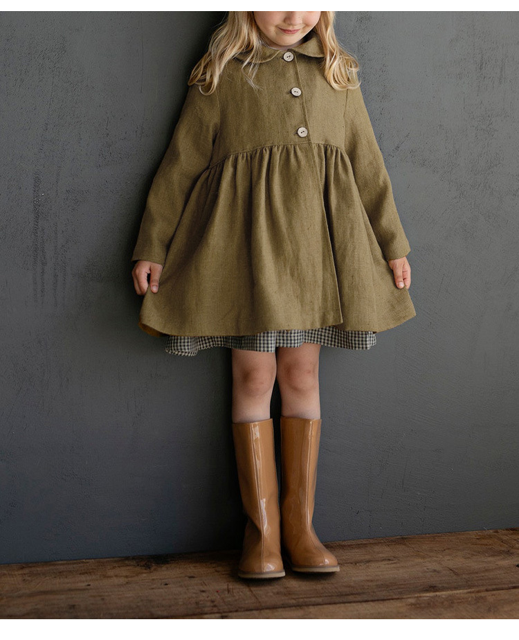 26년 가을 신상품 인형 칼라 면마 소재 여아 코트, 숲속 공주풍 허리 주름 장식 밑단 긴팔 여아 원피스