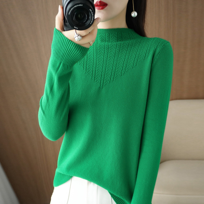 이른 가을 최고 여성의 새로운 얇은 반 터틀넥 긴 소매 니트 바닥 셔츠 짧은 느슨한 내부 스웨터 탑