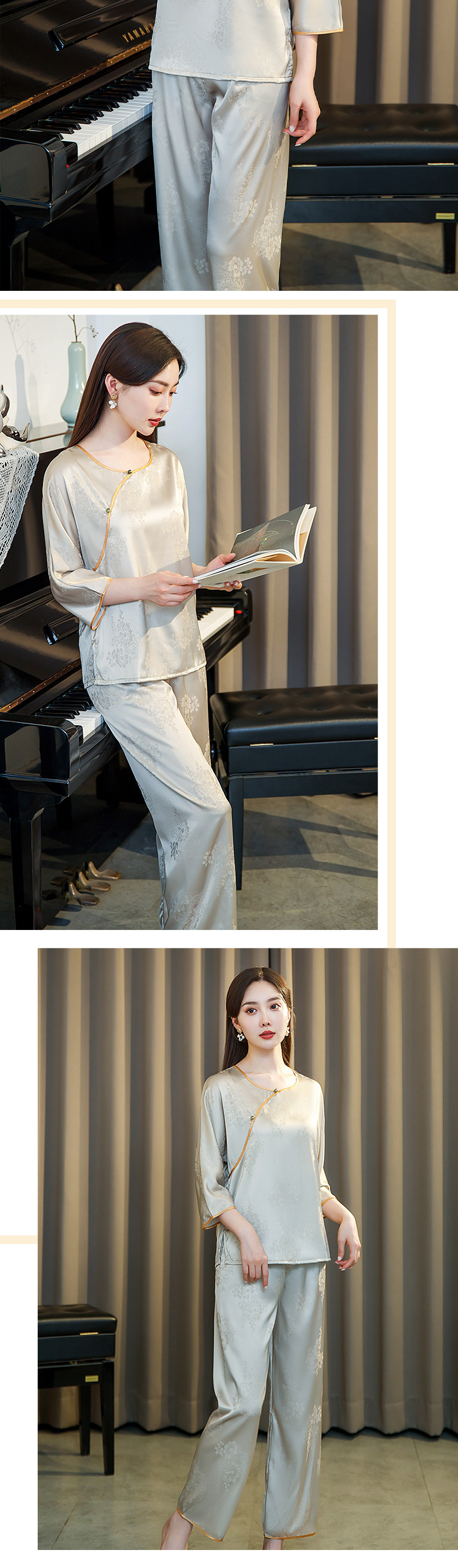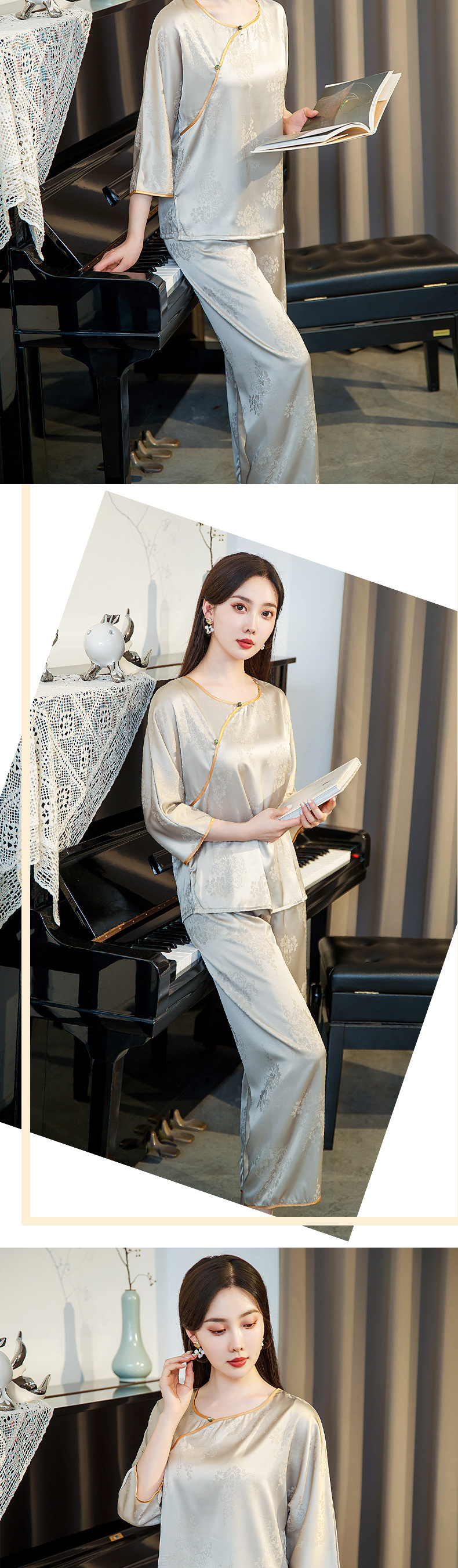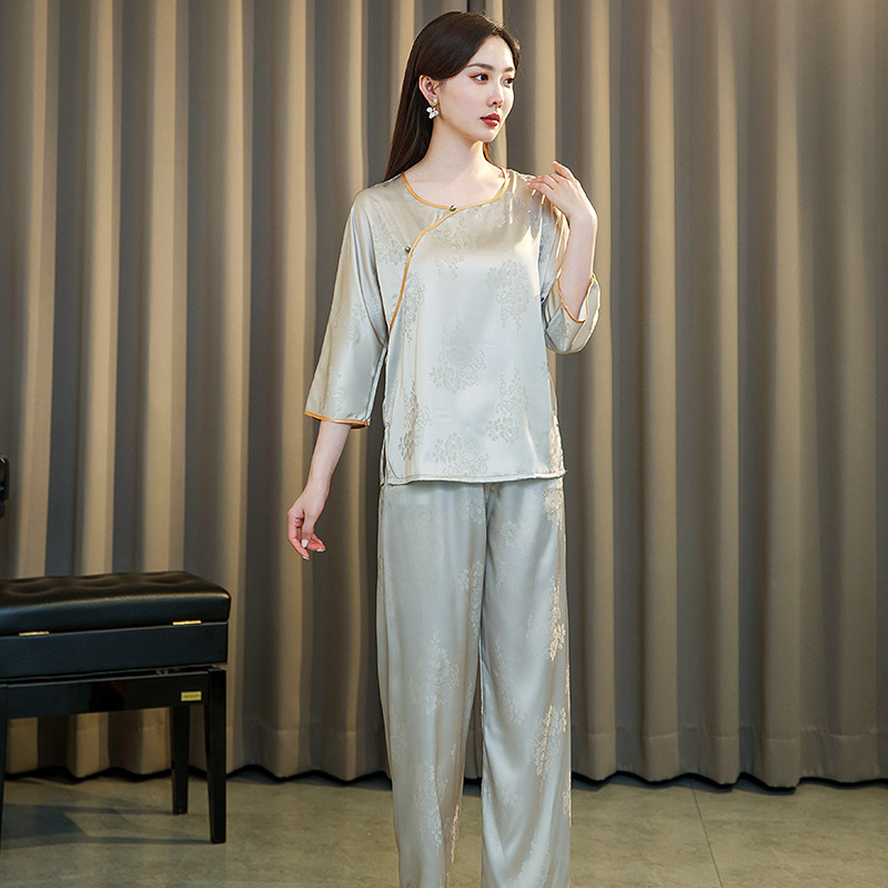 새로운 아이스 실크 잠옷 여자의 여름 중국 스타일 국가 스타일 세트 실크 새틴 풀오버 자카드 겉옷
