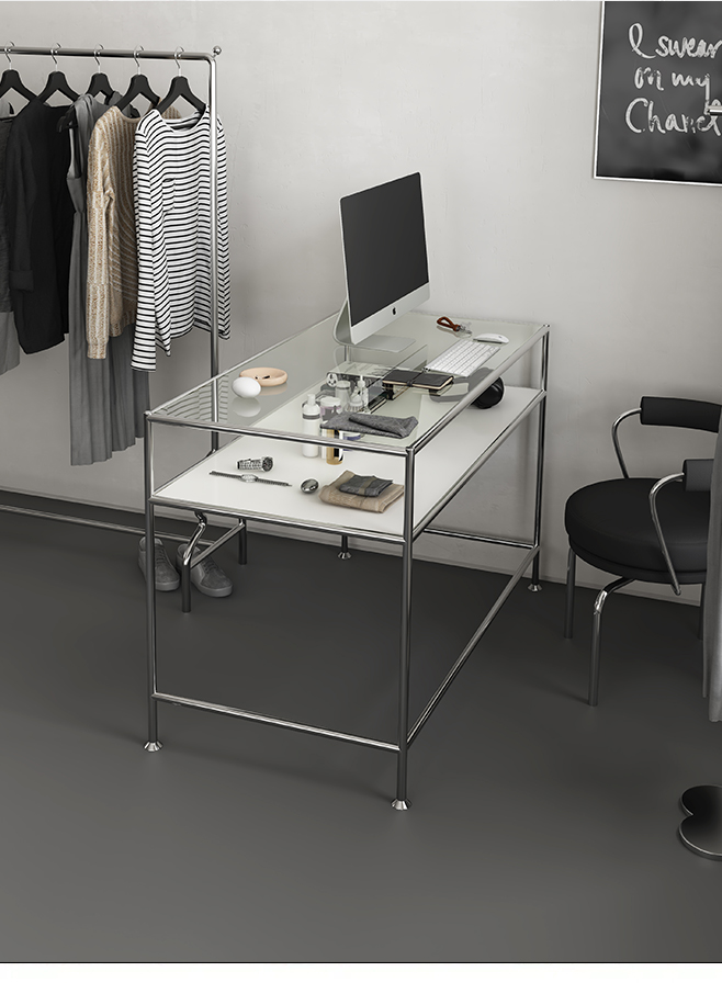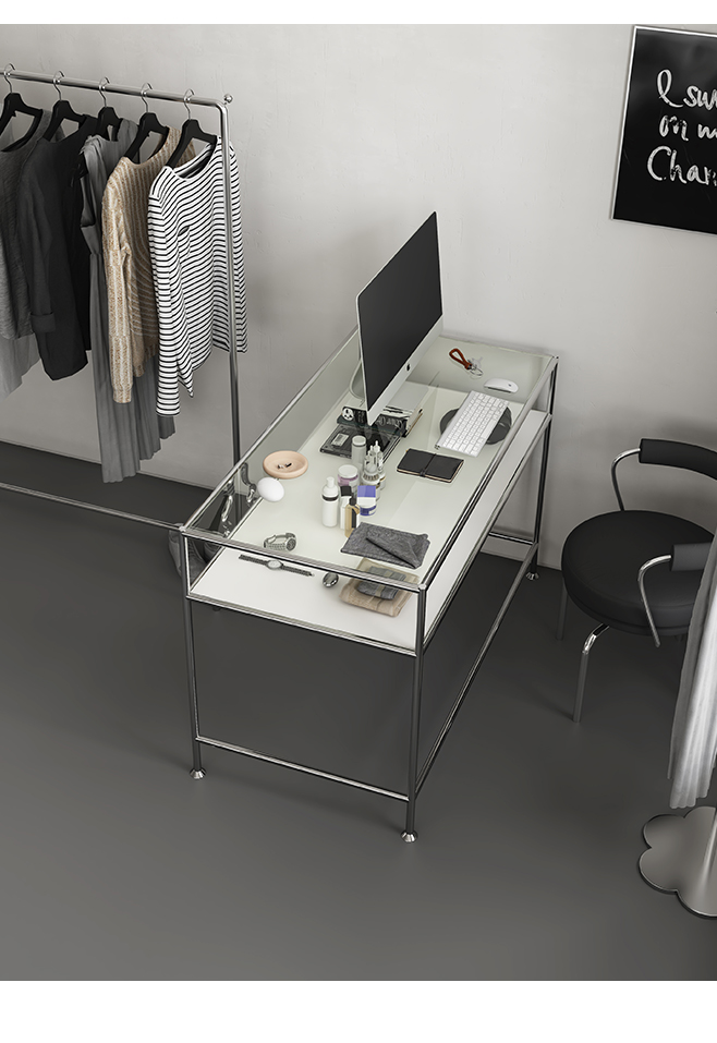 덴마크 디자이너 홈 긴 사무실 작업 유리 책상 매우 간단한 스테인레스 스틸 컴퓨터 디스플레이 의류 매장스토어 가기
