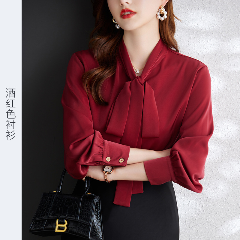 2022 가을 새로운 빨간 셔츠 전문 쉬폰 리본 셔츠 여성 디자인 감각 틈새 긴 소매 기질 셔츠
