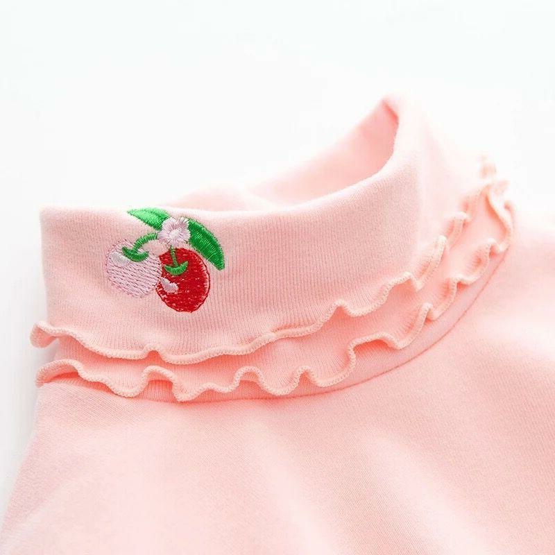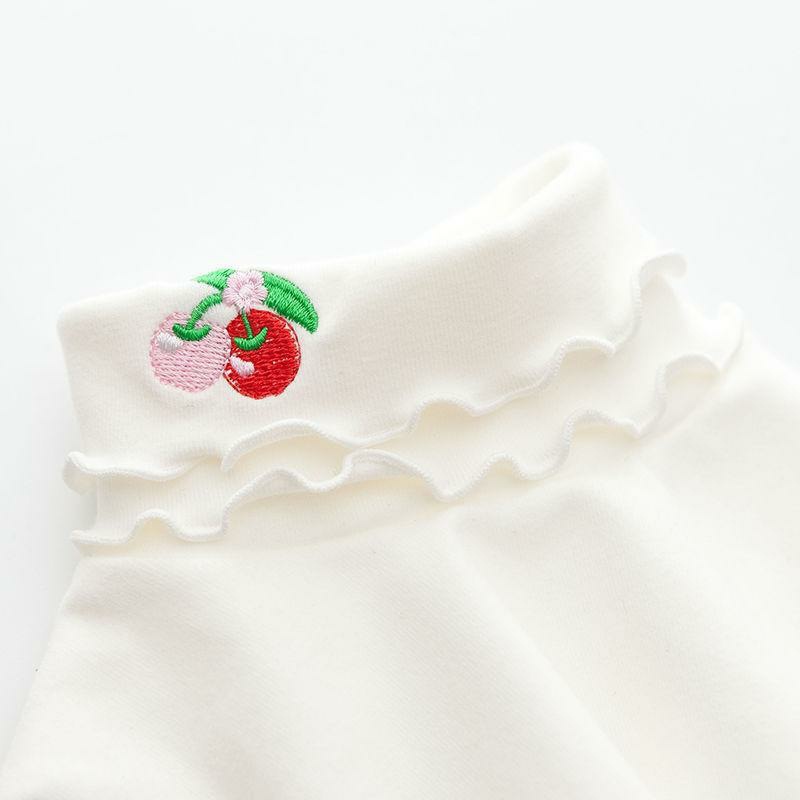 가을과 겨울 여성 아동복 베이스 셔츠 아기 세련된 어린이 특유의 유행 브랜드 한국 스타일 기모 하이 칼라 레이스 체리 탑