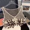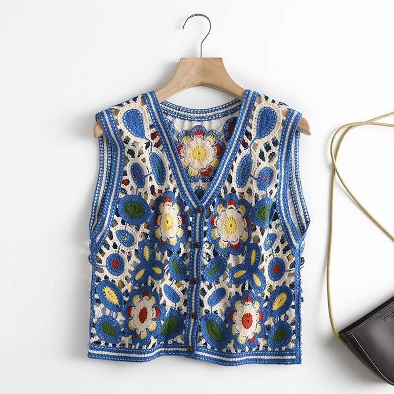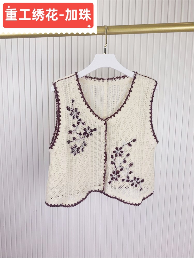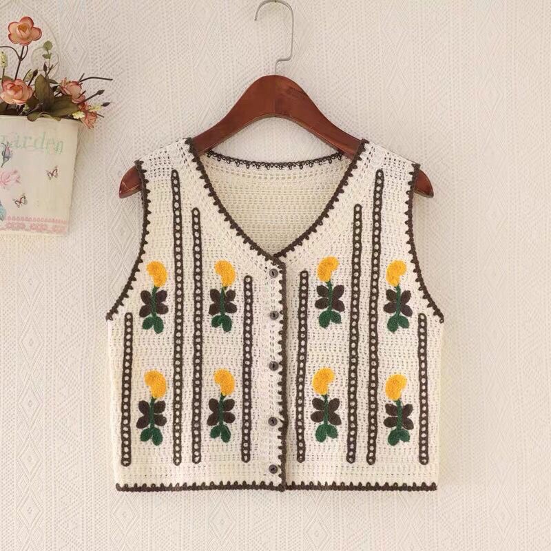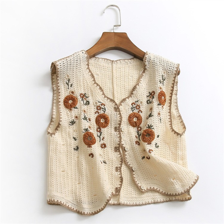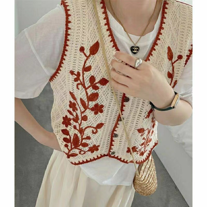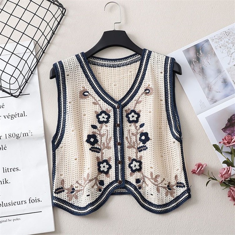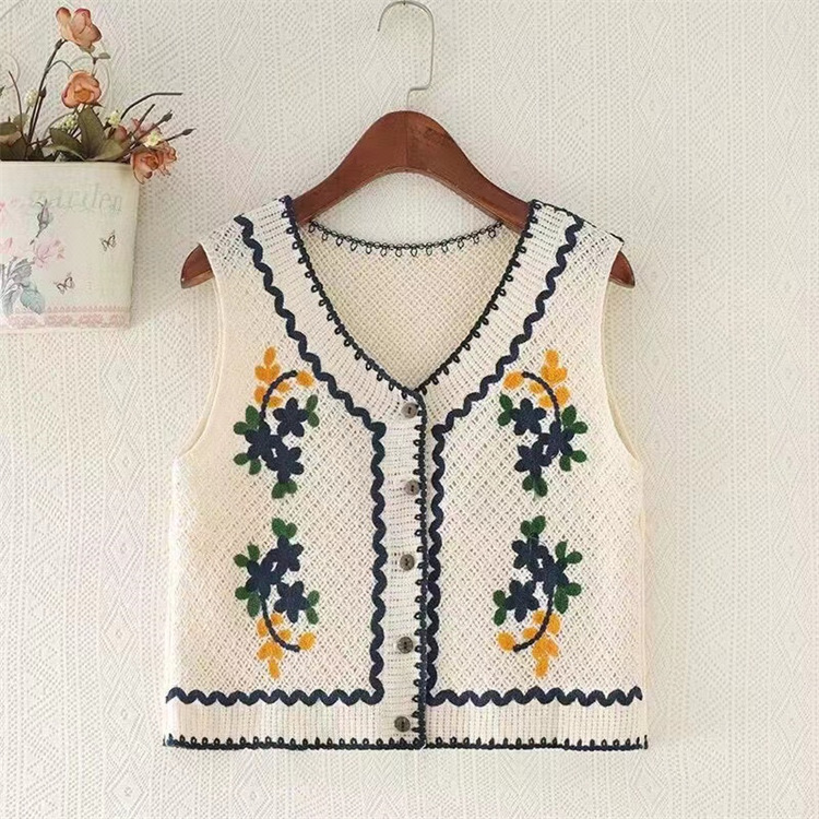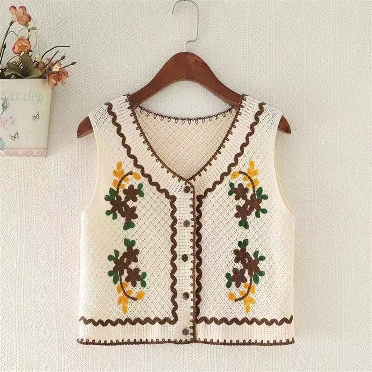 에스닉 스타일 자수 조끼 가디건 V 넥 중공 민소매 자수 짧은 조끼 여성 탑