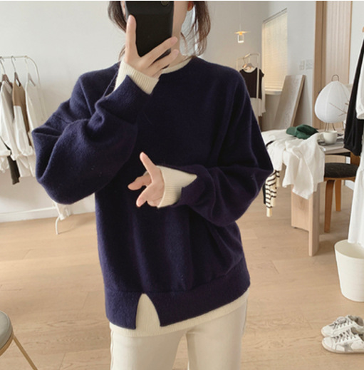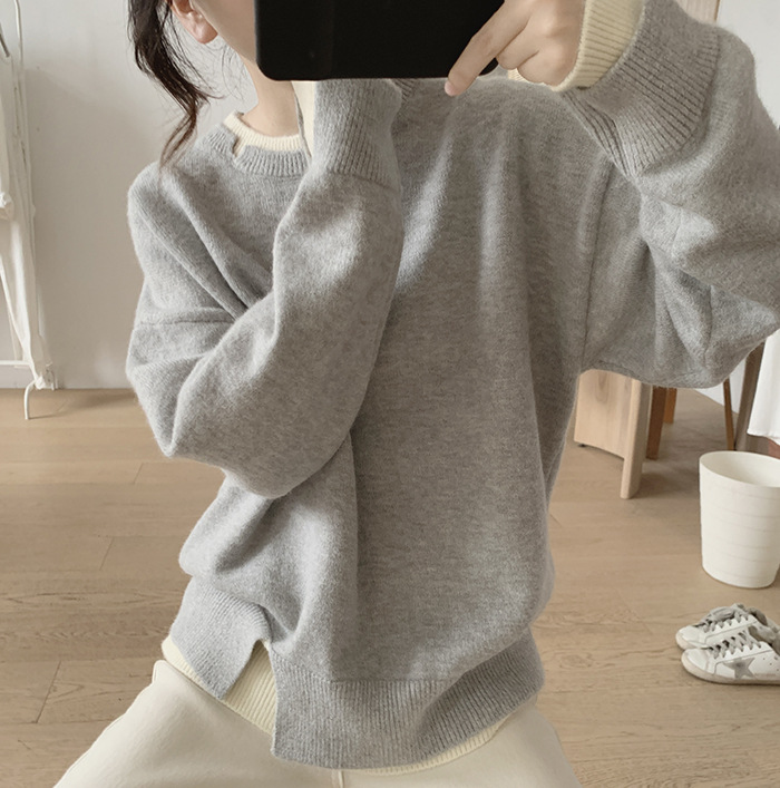 가을과 겨울의 새로운 라운드 넥 스웨터 코트 여성의 느슨한 슬리밍 가짜 투피스 스플릿 스티칭 풀오버 연령 감소 스웨터
