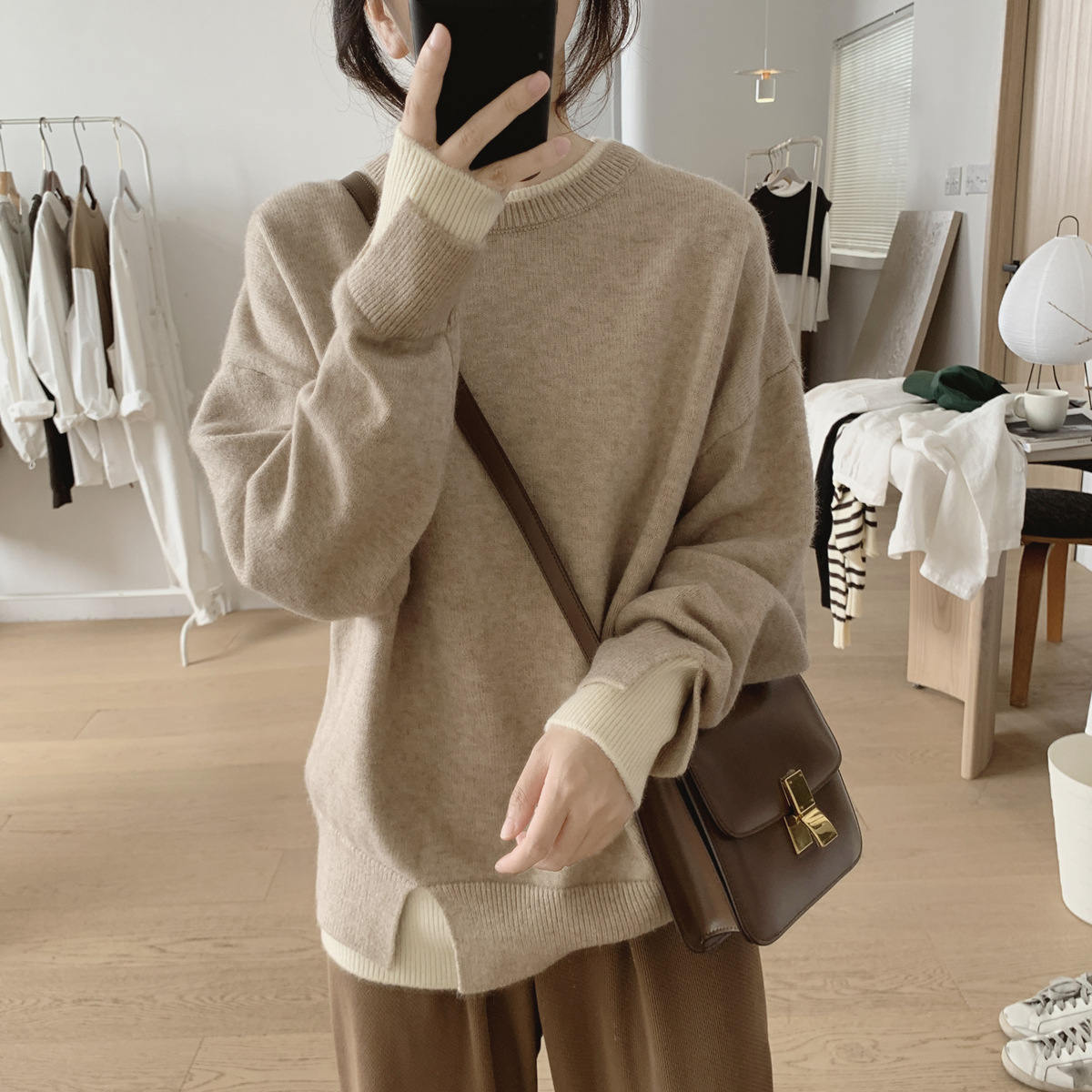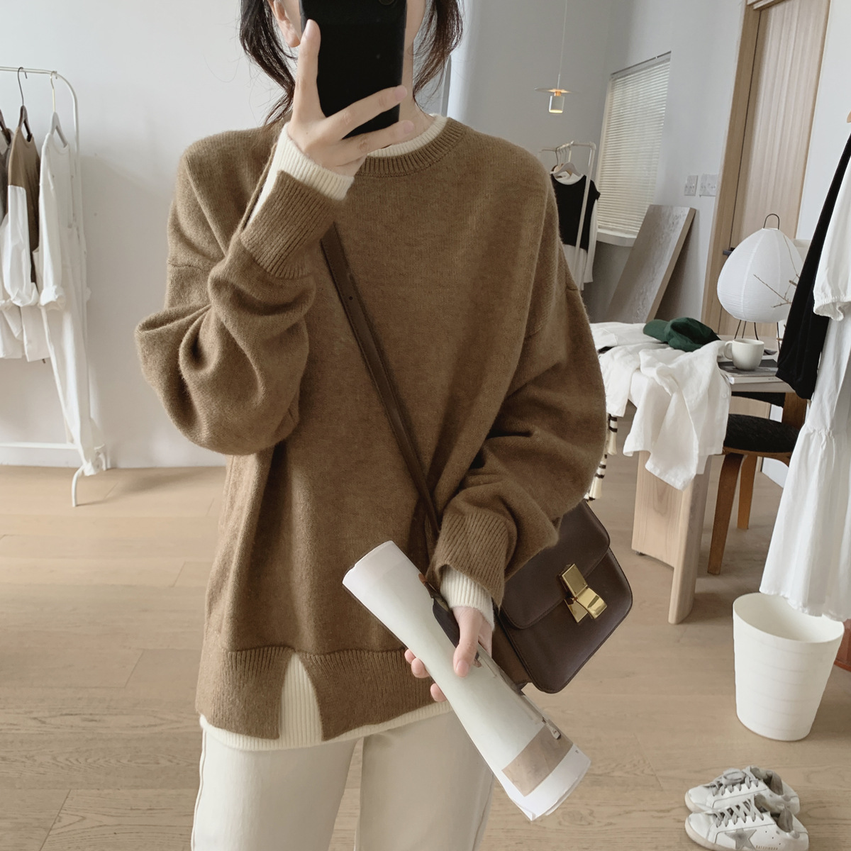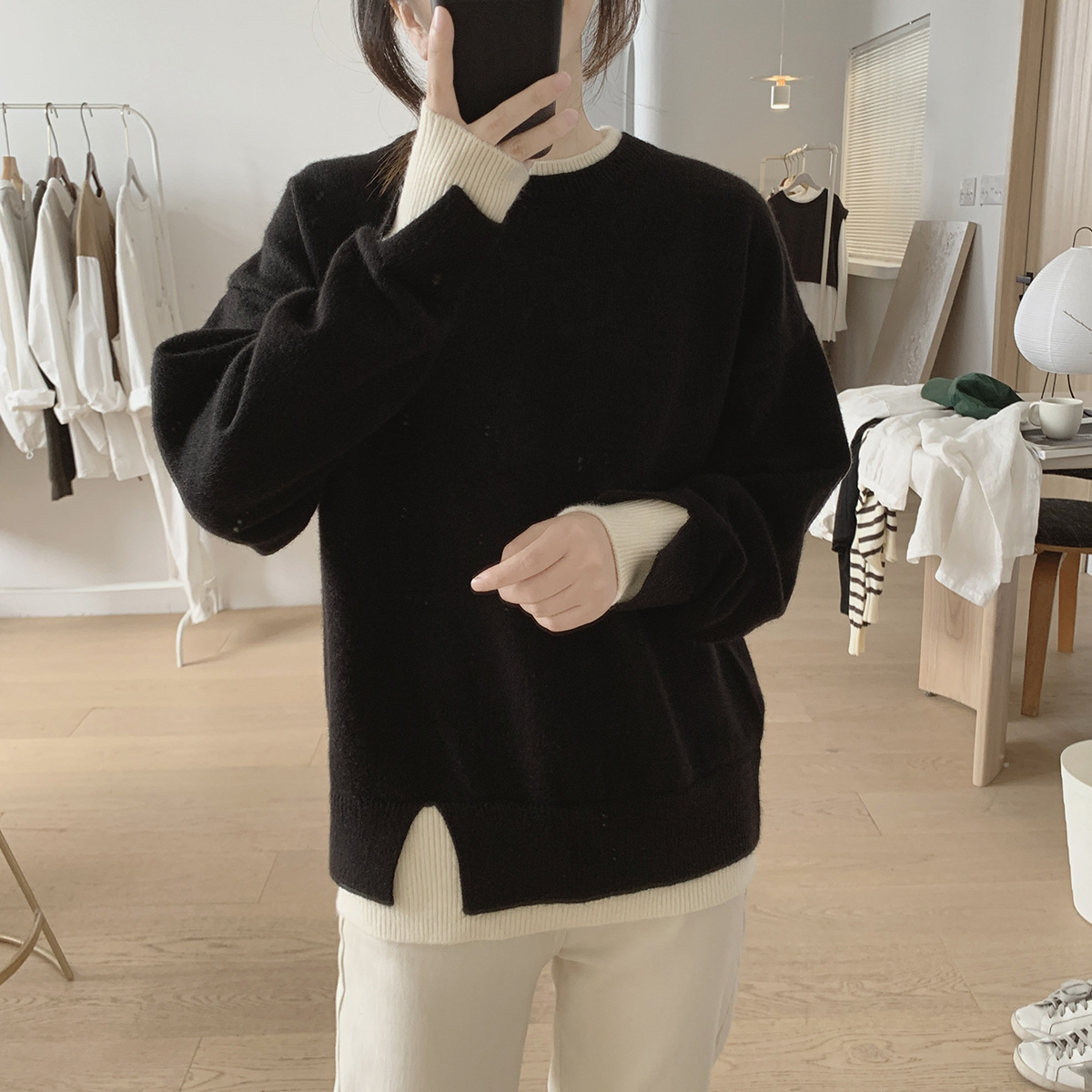 가을과 겨울의 새로운 라운드 넥 스웨터 코트 여성의 느슨한 슬리밍 가짜 투피스 스플릿 스티칭 풀오버 연령 감소 스웨터스토어 가기