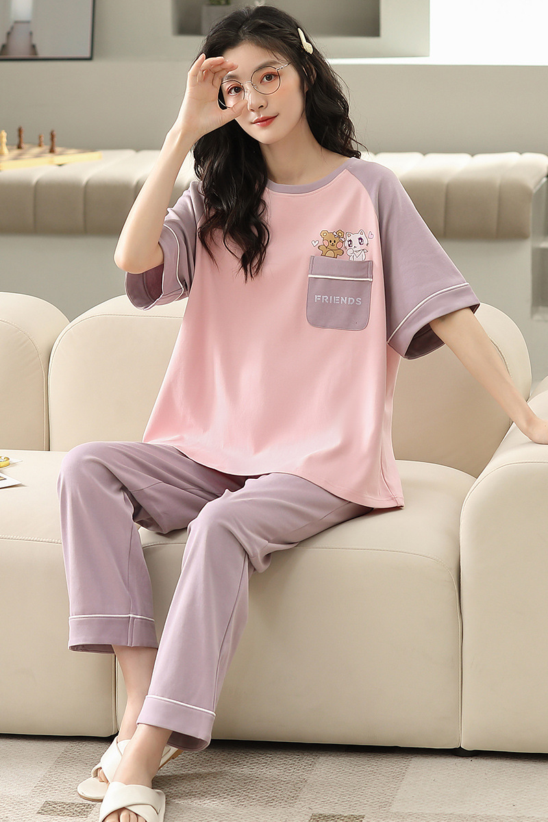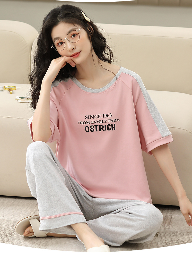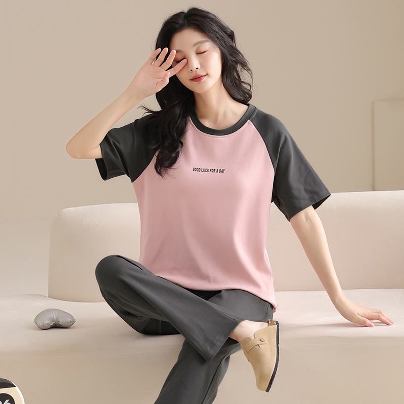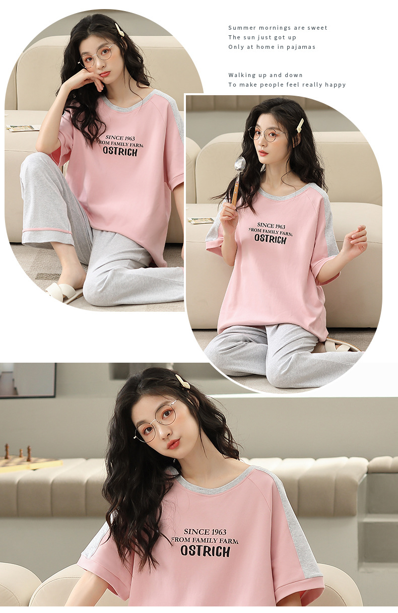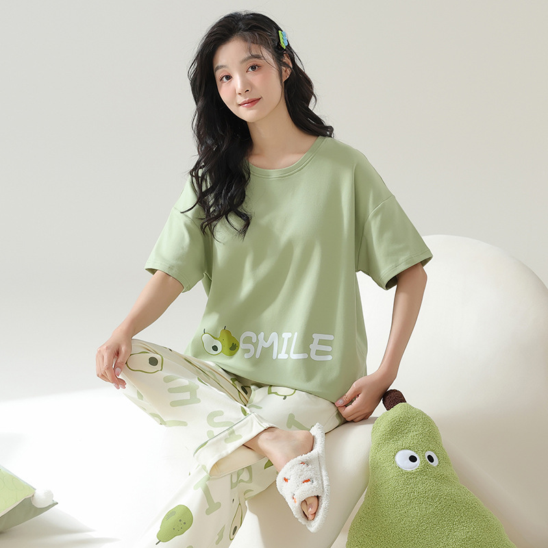 [순면] 잠옷 여성 여름 반소매 바지 얇은 여성 수분 흡수 통기성 아웃웨어 홈 의류 여성 세트