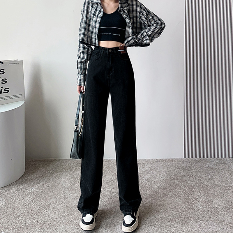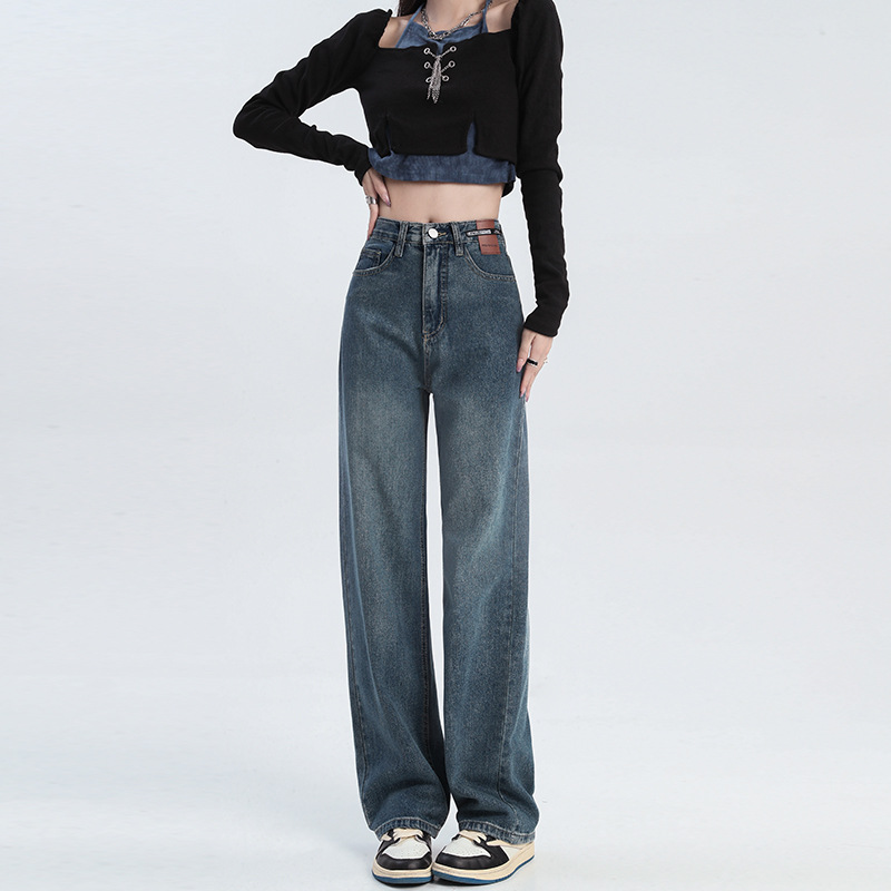 한국식 캐주얼 올 매치 디자인 센스 라벨 청바지 여성 가을과 겨울 하이 웨이스트 스트레이트 튜브 드레이프 센스 와이드 레그 플로어 팬츠스토어 가기