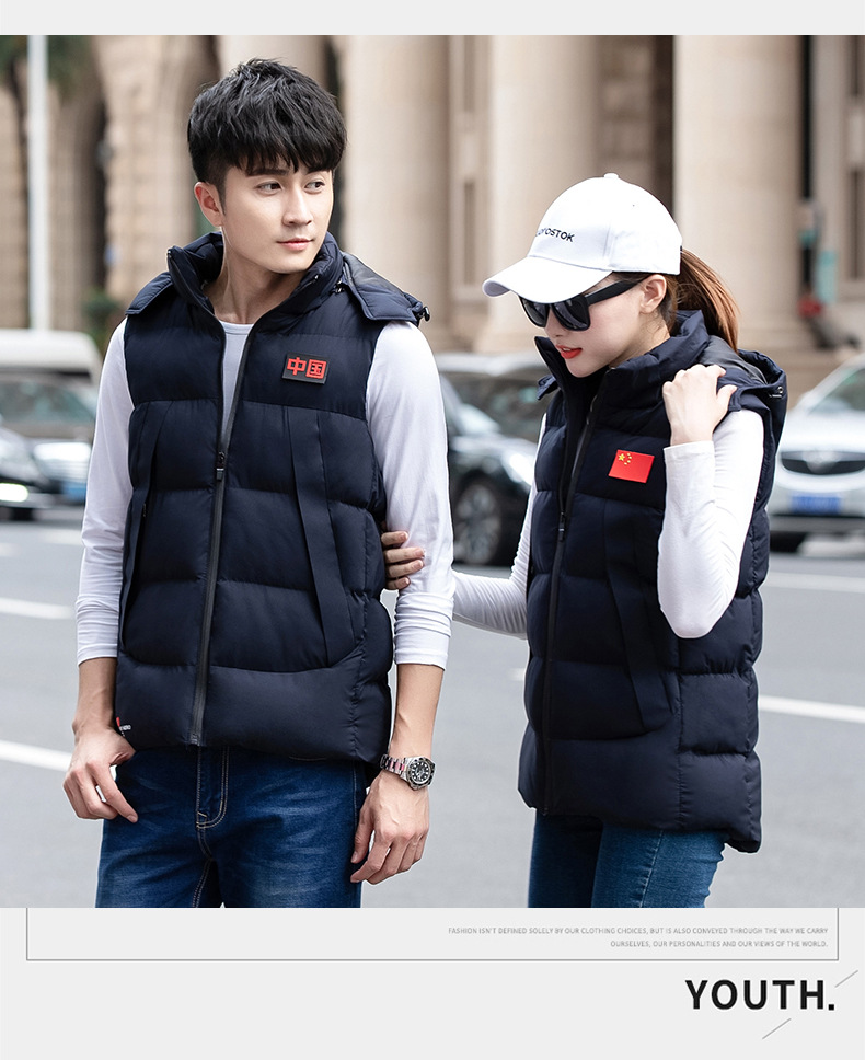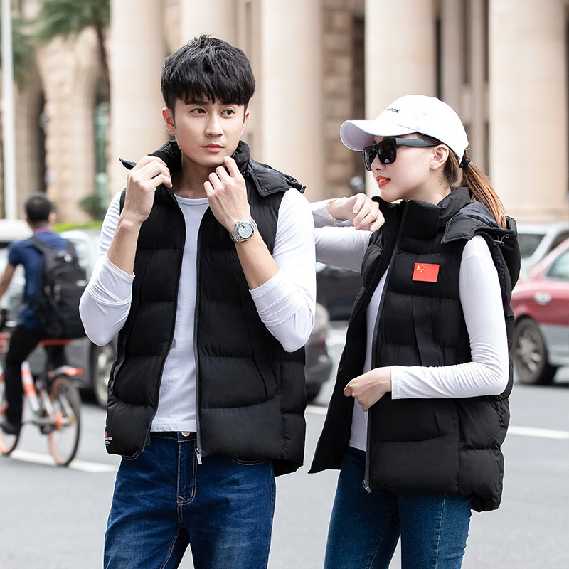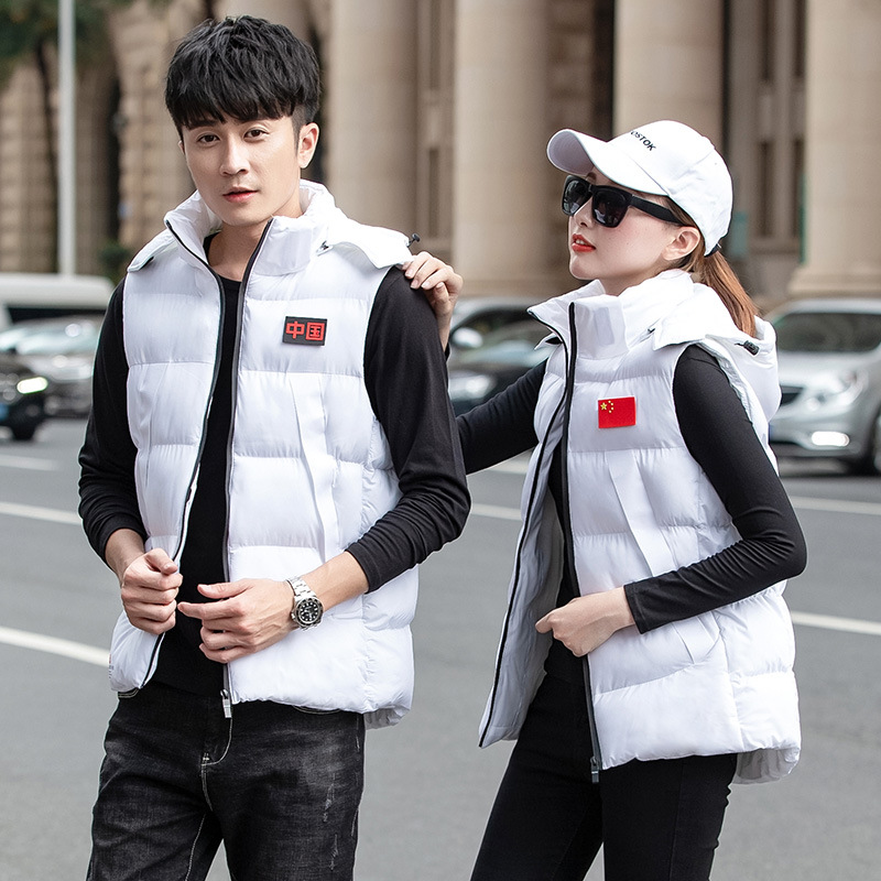 새로운 후드 다운 코튼 스포츠 조끼 겨울 남녀 커플 양복 조끼 코치 훈련 전국 코트 도매