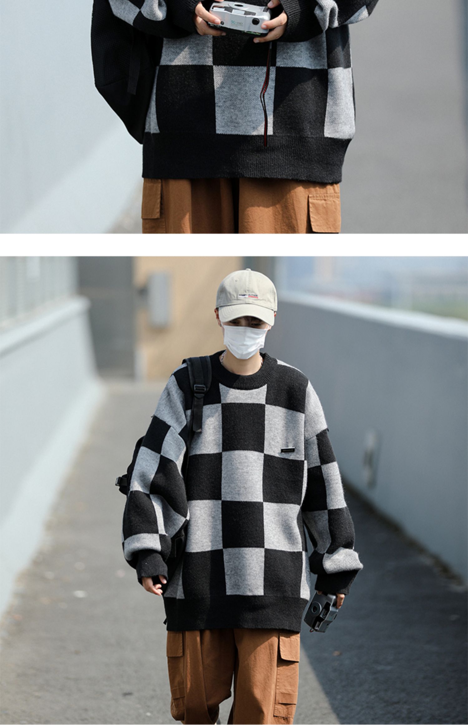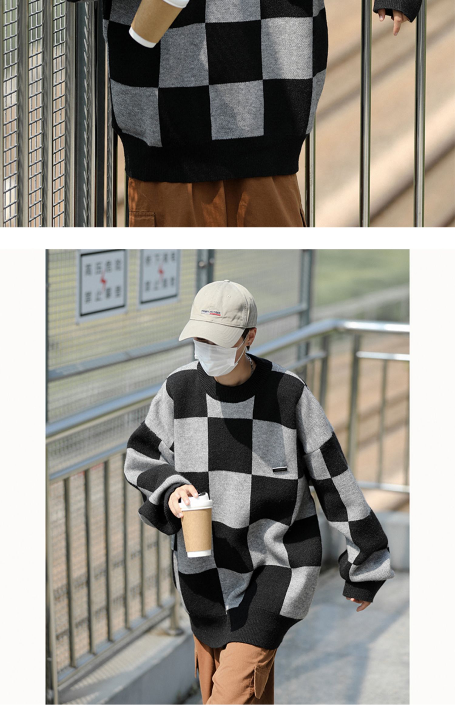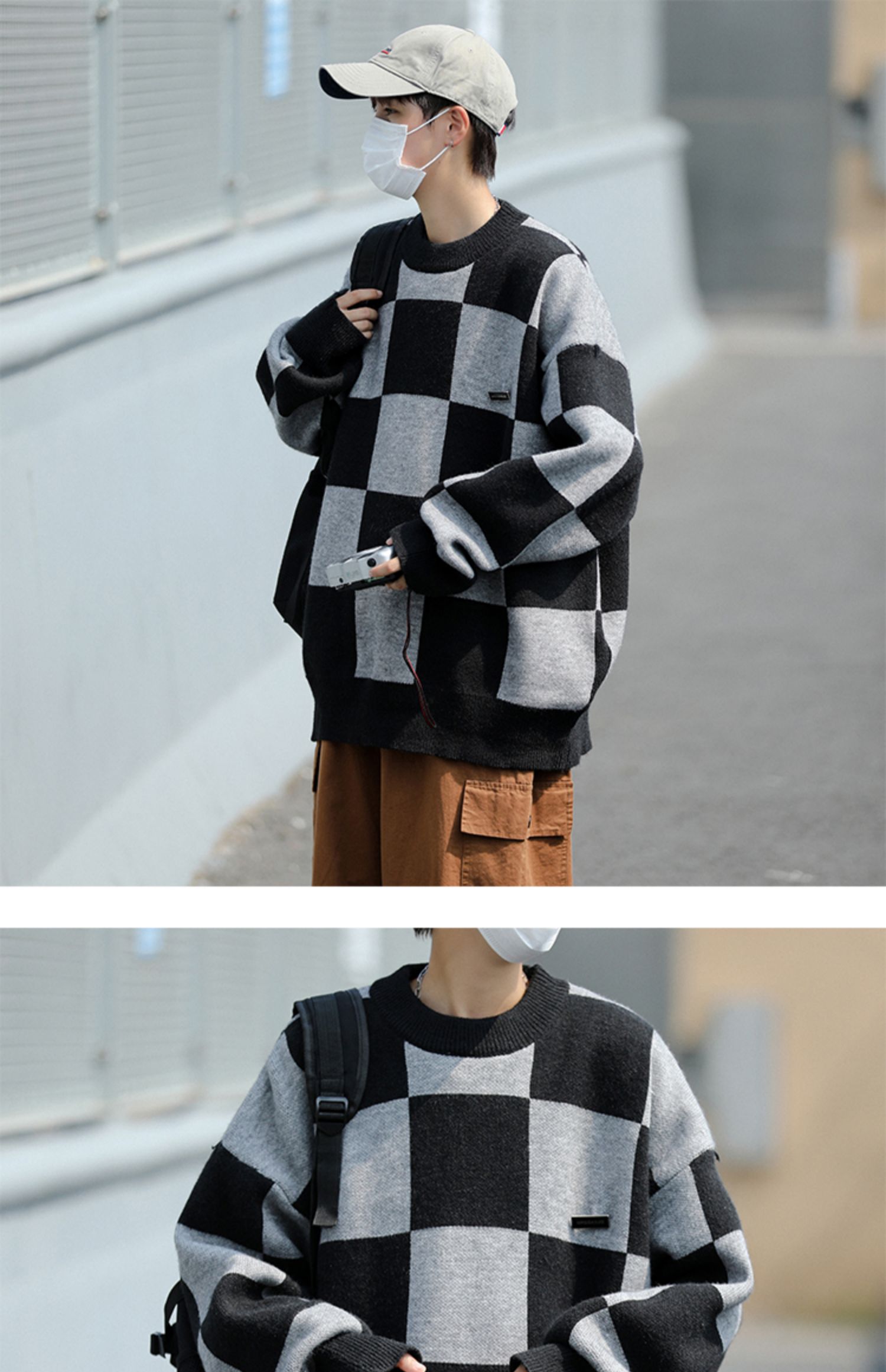 黑色棋盘格毛衣男秋冬季潮牌潮流休闲撞色圆领小众宽松情侣针织衫
