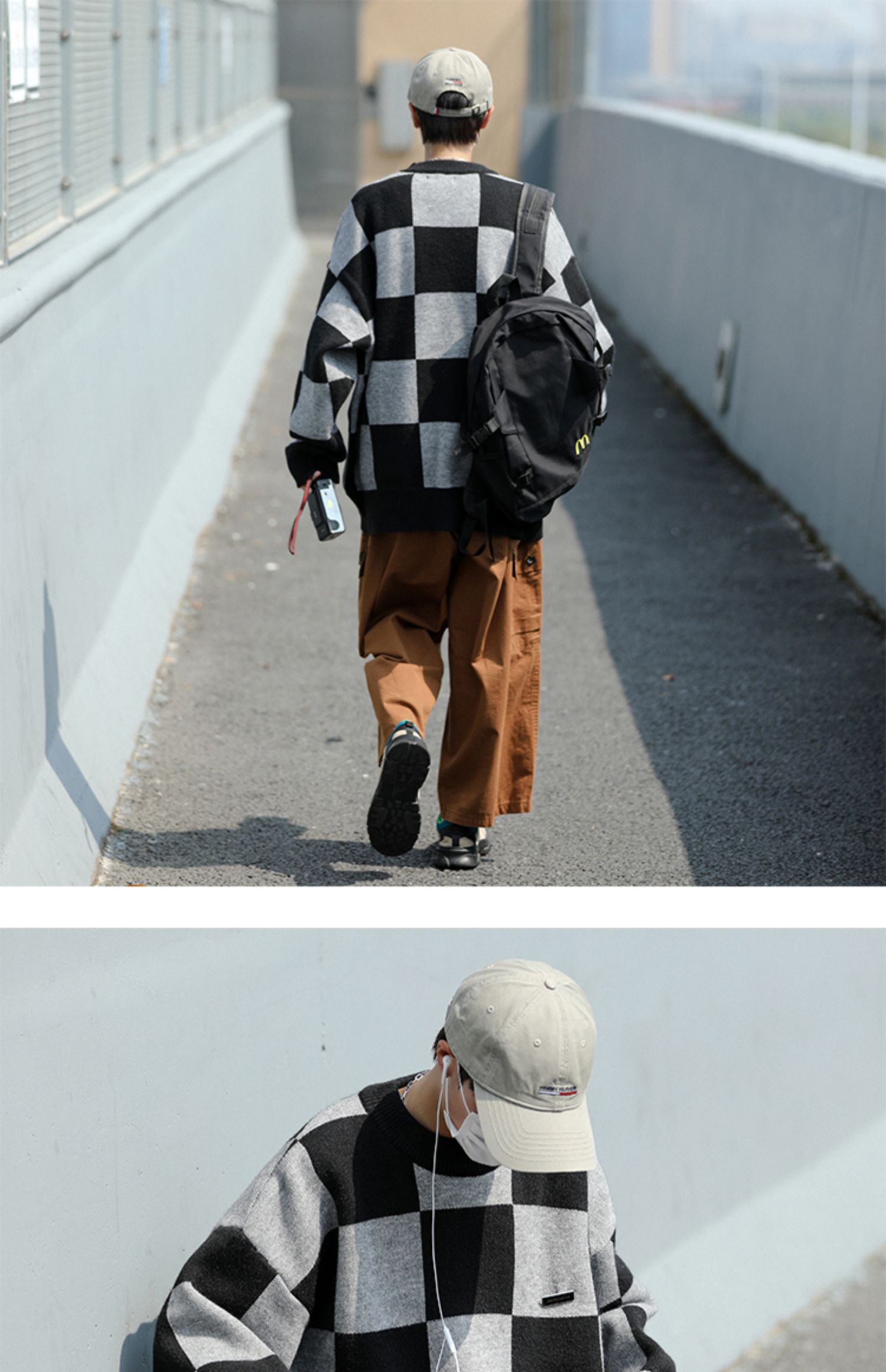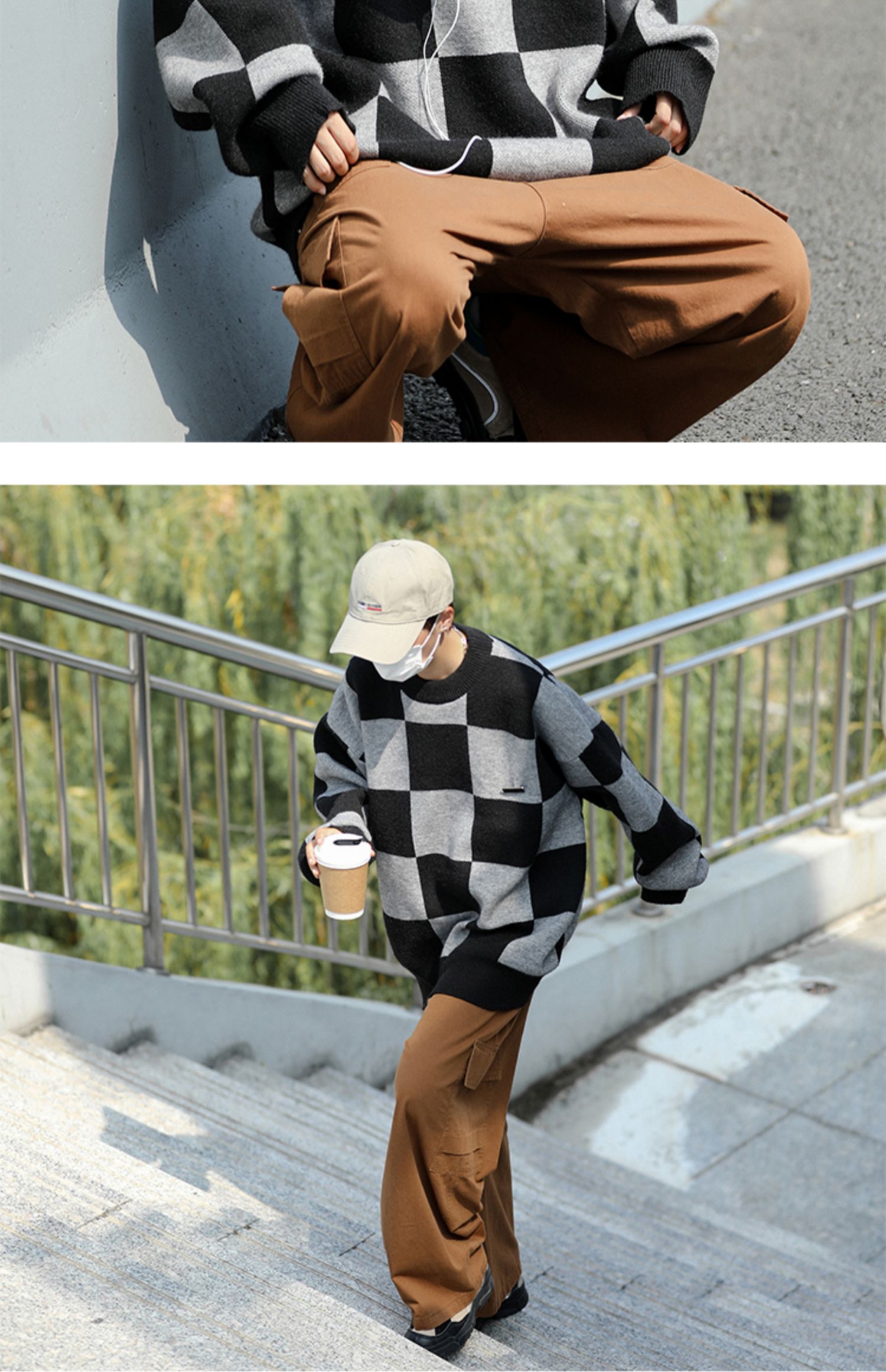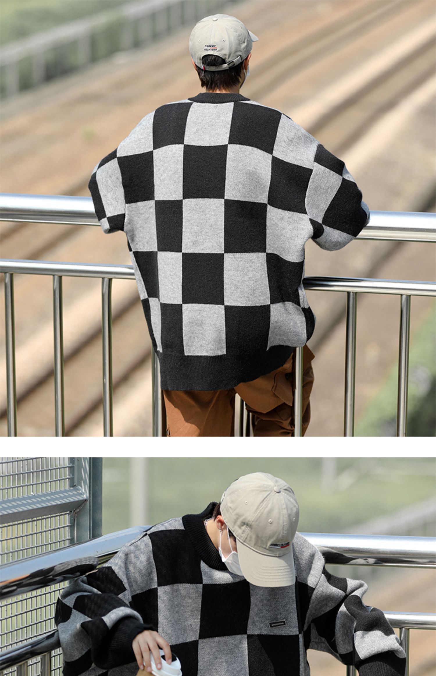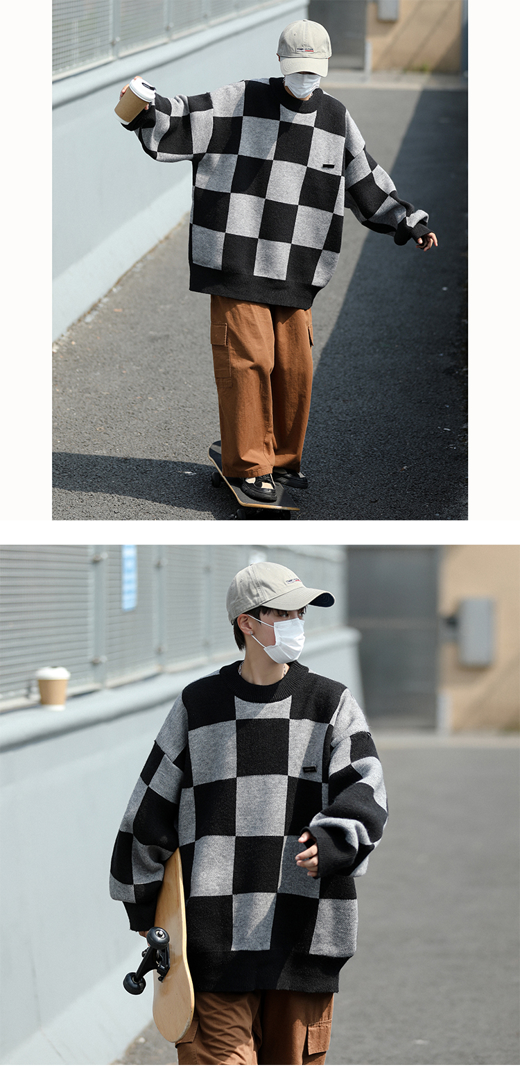黑色棋盘格毛衣男秋冬季潮牌潮流休闲撞色圆领小众宽松情侣针织衫