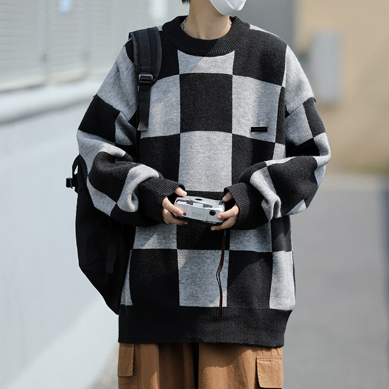 블랙 바둑판 스웨터 남성용 가을과 겨울 트렌디 한 브랜드 캐주얼 대조 색상 크루넥 틈새 느슨한 커플 스웨터