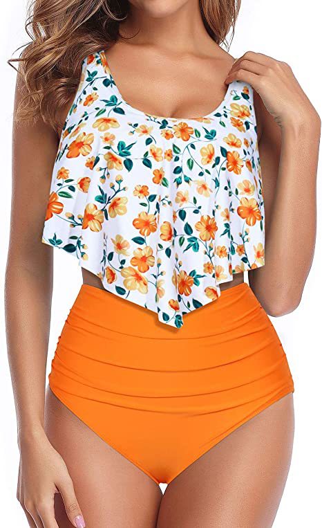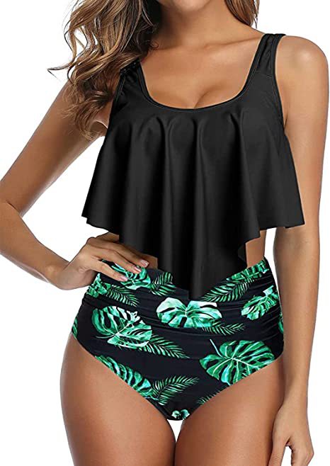 국경 간 투피스 비키니 수영복 여성용 러플 탑 하이 허리 주름 하단 수영복스토어 가기
