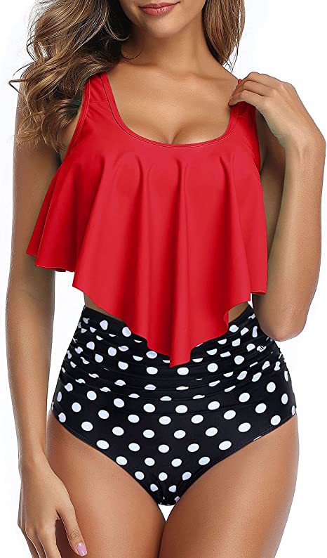국경 간 투피스 비키니 수영복 여성용 러플 탑 하이 허리 주름 하단 수영복