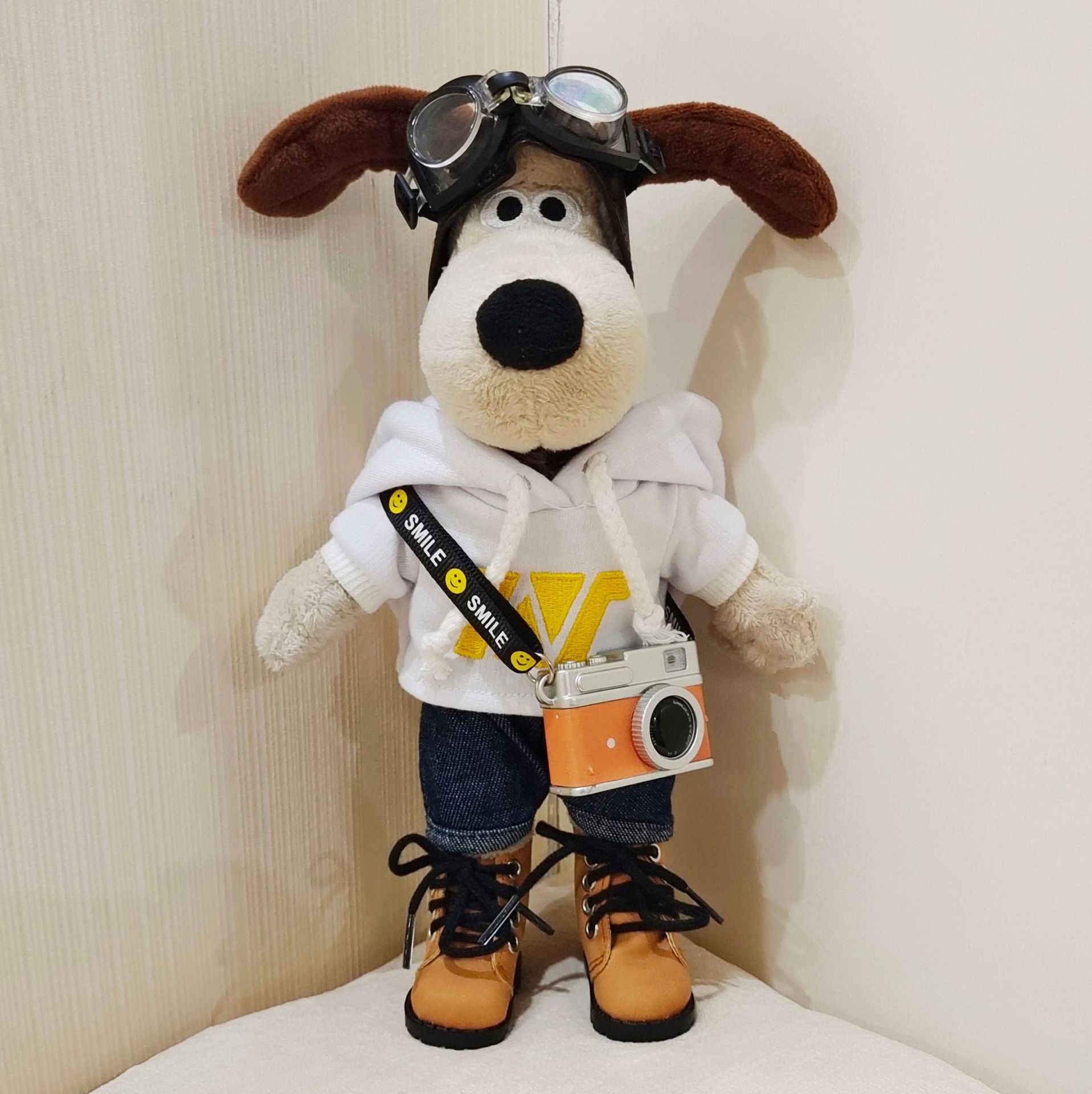 • 다크 브라운 스웨터 화이트 스카프 5 종 세트 + 화이트 가죽 신발 블랙 카메라