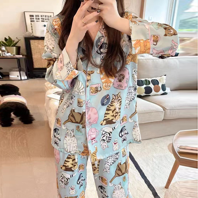 여성용 잠옷, 여름 아이스 실크 긴팔 만화 고양이 프린트 세트, 인기 라이브 방송 봄, 가을 대형 홈웨어, 달콤한스토어 가기